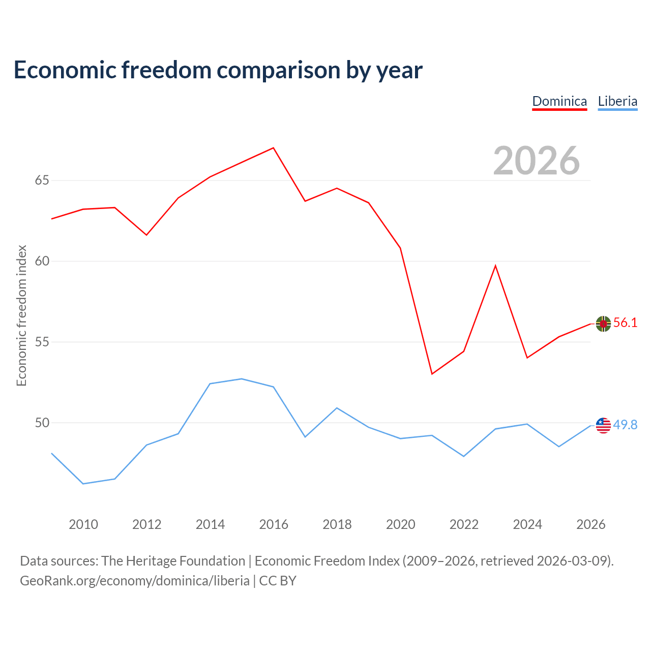 The Economic Freedom Index for Dominica is 56.1, ranking 124/197, compared to 49.8 for Liberia, ranking 163/197. The chart above displays a comparison of annual changes in economic freedom indexes.
