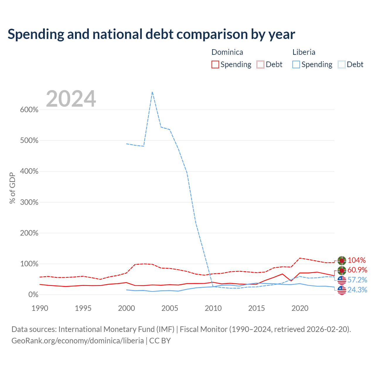 Dominica has $713M in government debt (103.5% of GDP), compared to $2.73B (57.2% of GDP) in Liberia.