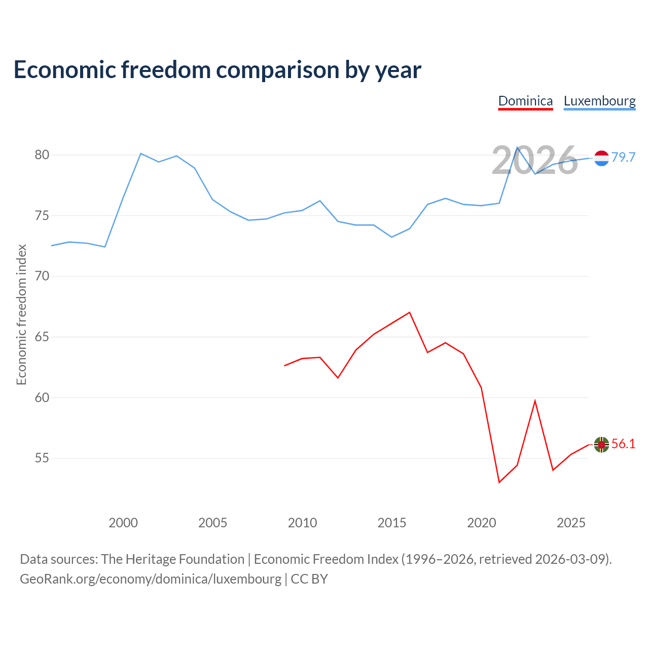 The Economic Freedom Index for Dominica is 56.1, ranking 124/197, compared to 79.7 for Luxembourg, ranking 7/197. The chart above displays a comparison of annual changes in economic freedom indexes.