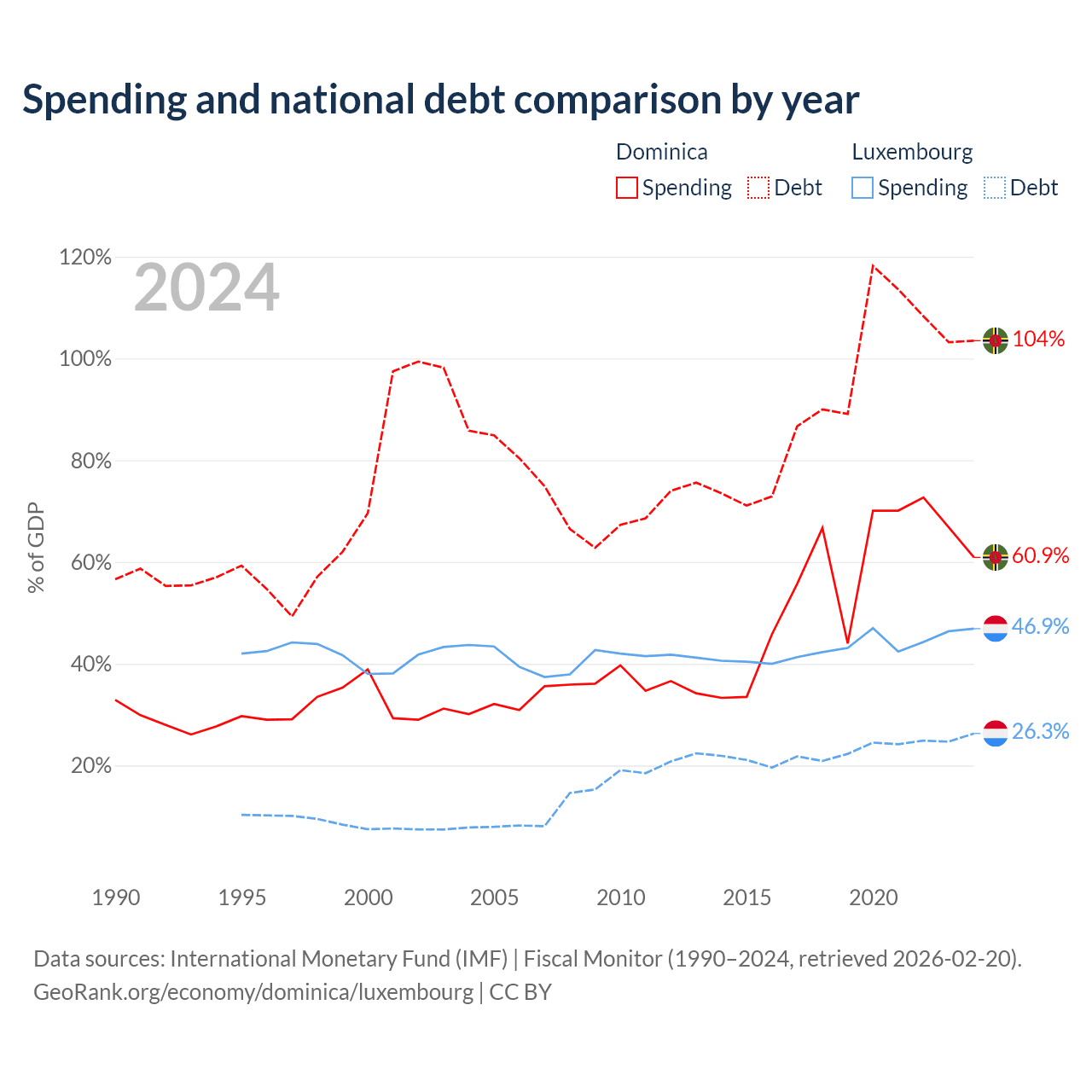 Dominica has $713M in government debt (103.5% of GDP), compared to $24.5B (26.3% of GDP) in Luxembourg.