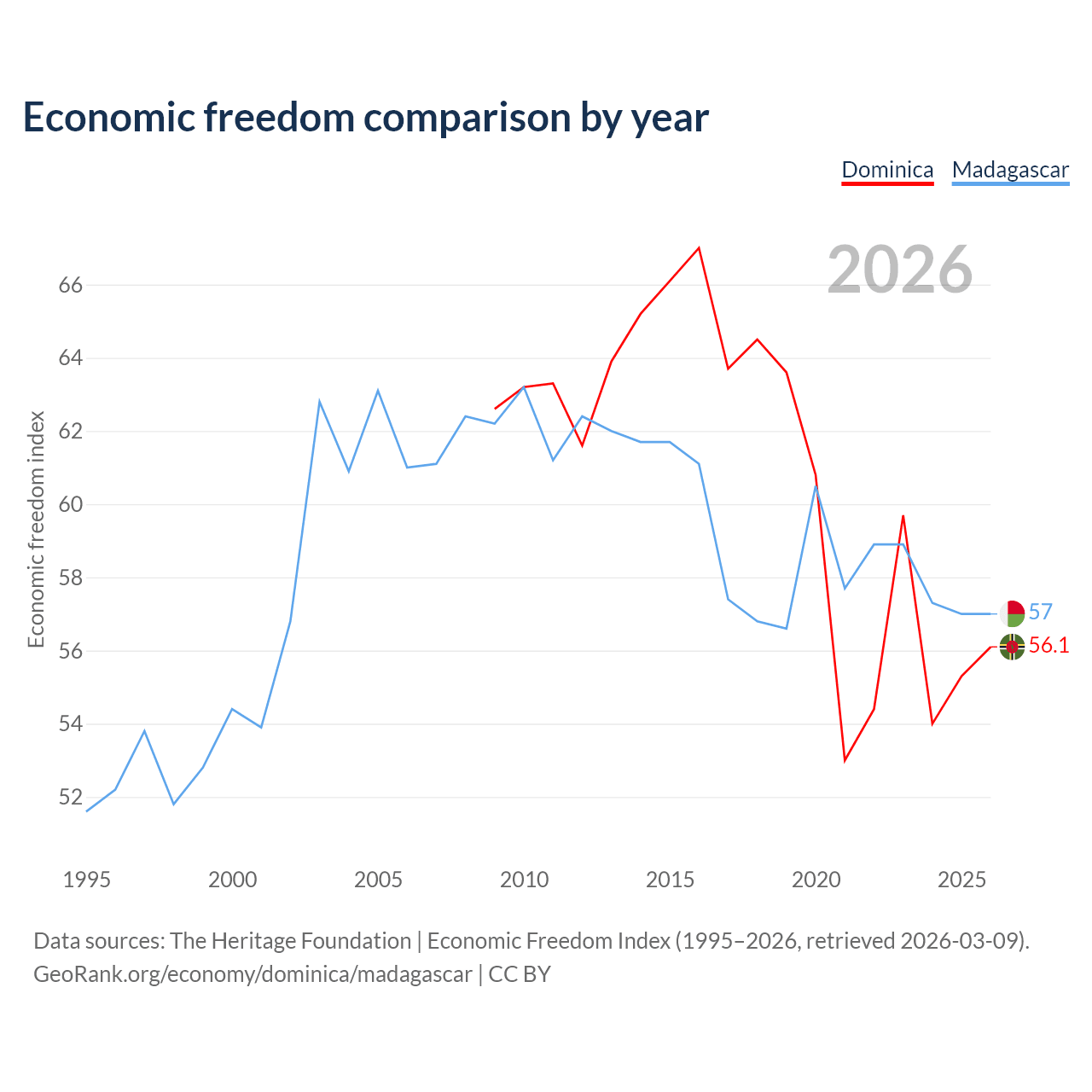 The Economic Freedom Index for Dominica is 56.1, ranking 124/197, compared to 57 for Madagascar, ranking 119/197. The chart above displays a comparison of annual changes in economic freedom indexes.