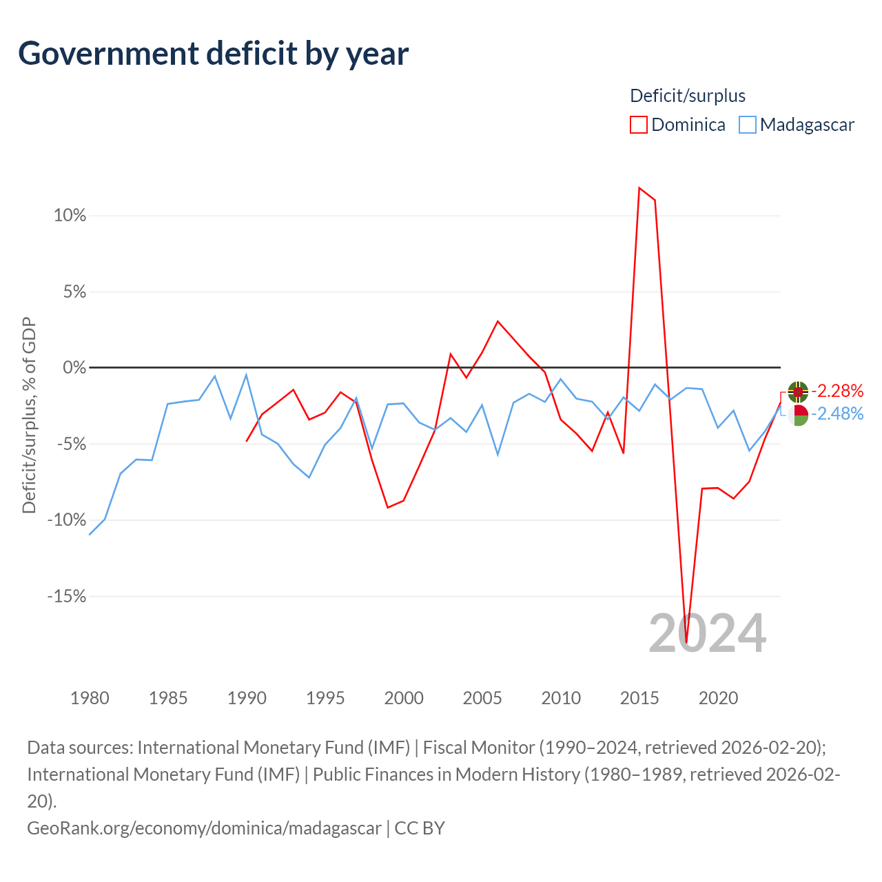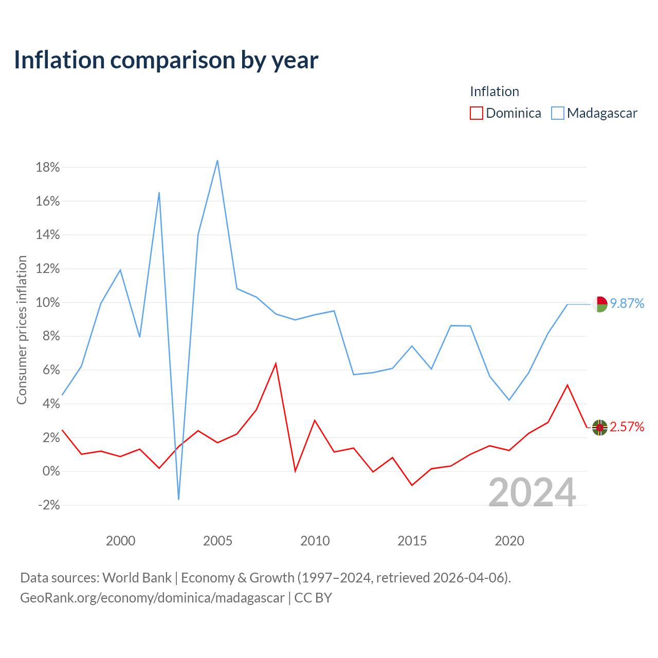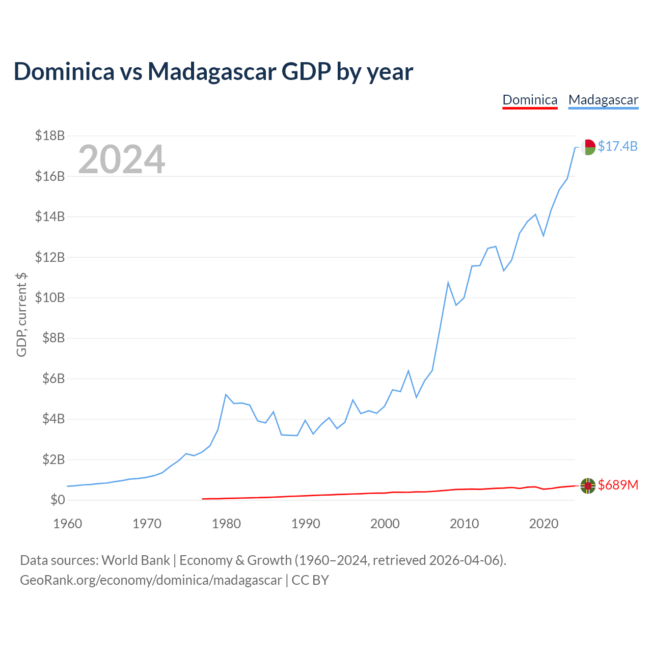 Dominica has a GDP of $689M compared to $17.4B for Madagascar, ranking 190/197 and 136/197 by economy size, respectively.