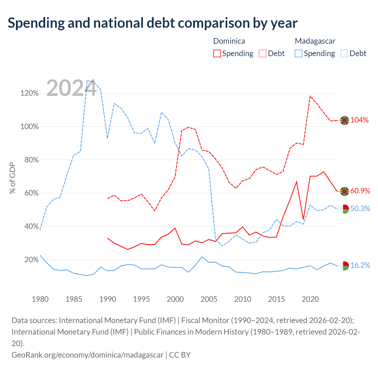Dominica has $713M in government debt (103.5% of GDP), compared to $8.77B (50.3% of GDP) in Madagascar.