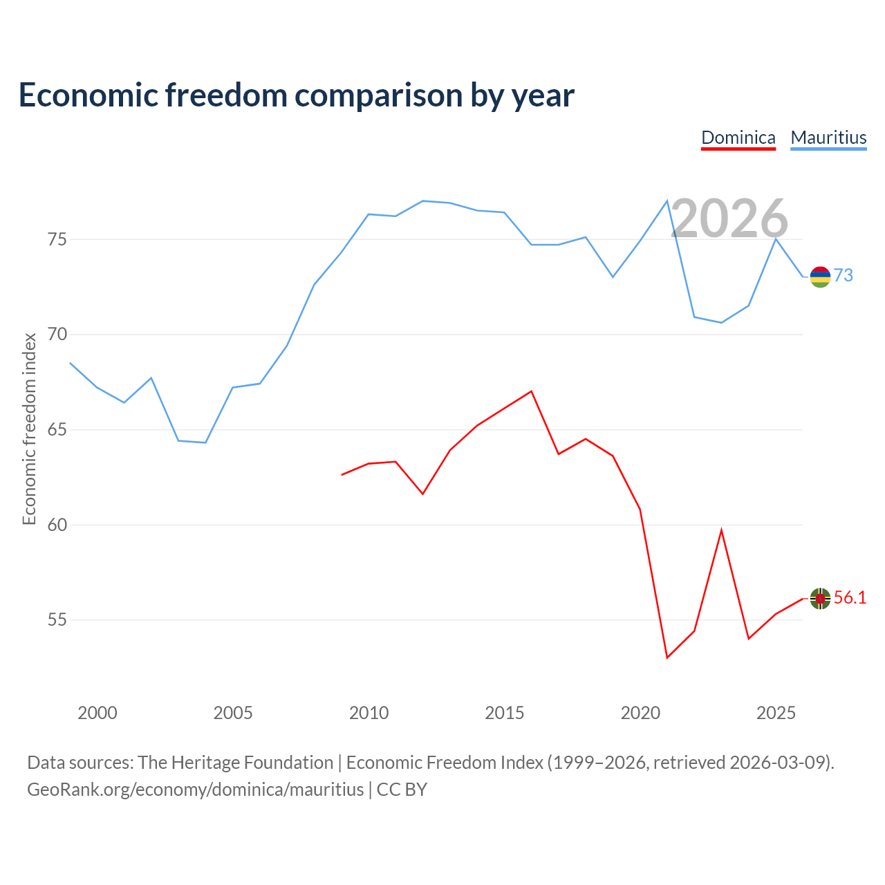 The Economic Freedom Index for Dominica is 56.1, ranking 124/197, compared to 73 for Mauritius, ranking 26/197. The chart above displays a comparison of annual changes in economic freedom indexes.