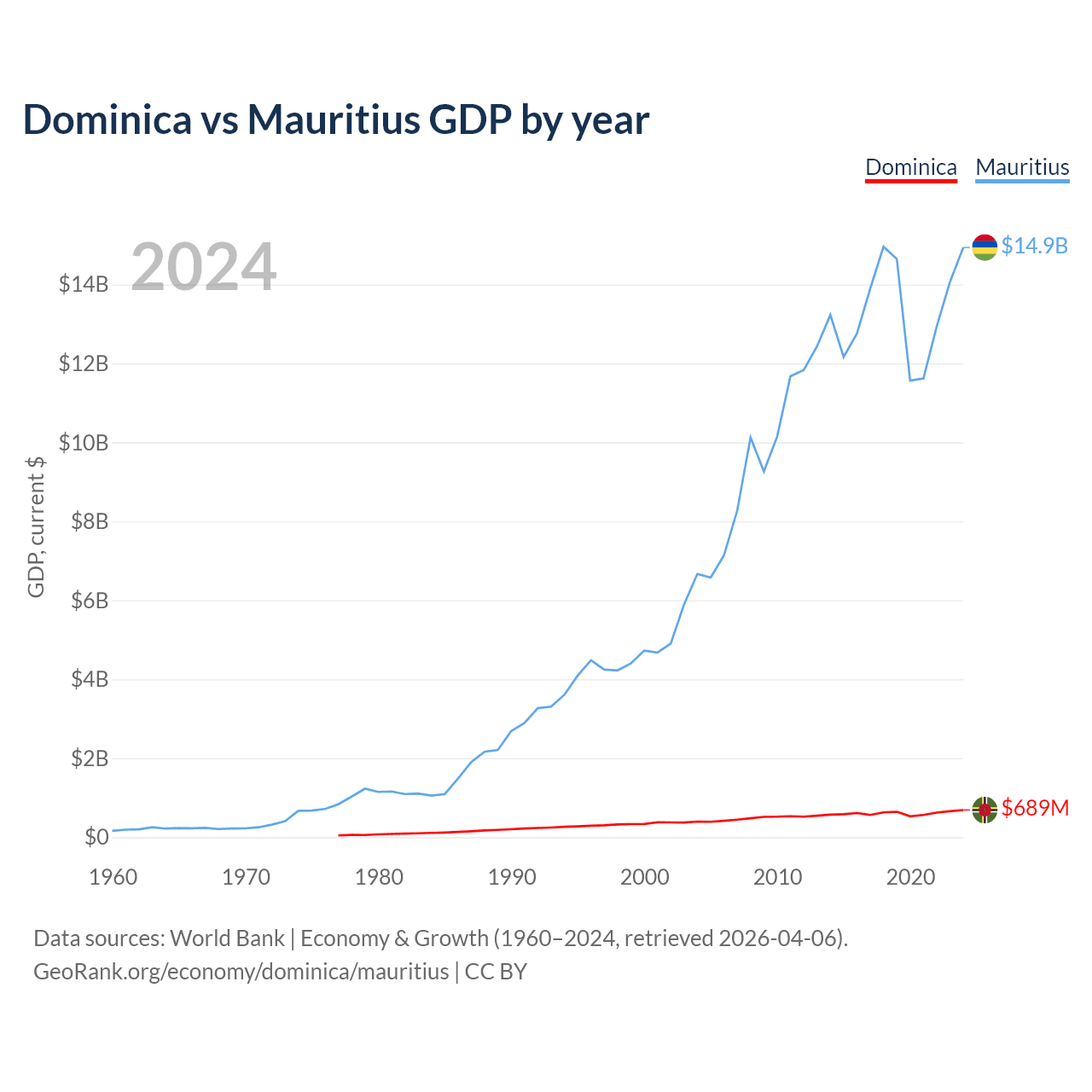 Dominica has a GDP of $689M compared to $14.9B for Mauritius, ranking 190/197 and 143/197 by economy size, respectively.