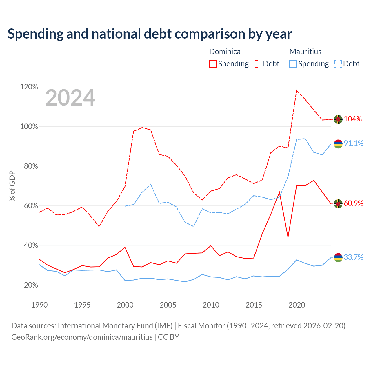 Dominica has $713M in government debt (103.5% of GDP), compared to $13.6B (91.1% of GDP) in Mauritius.