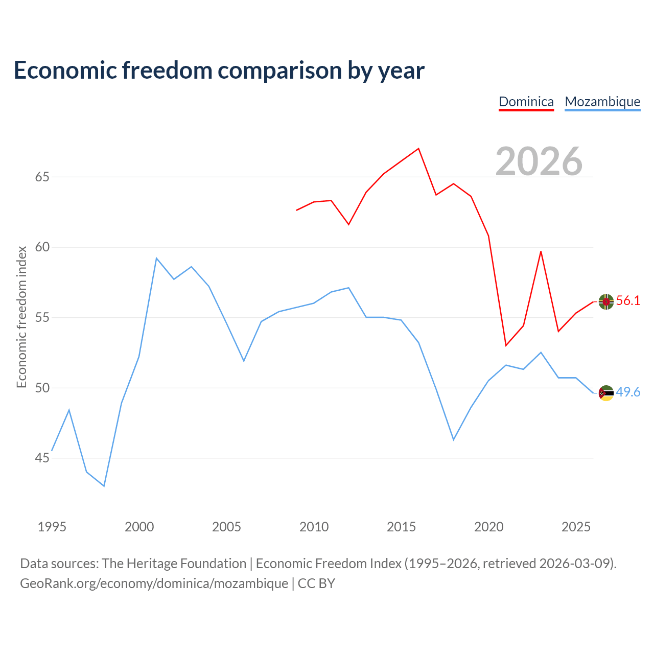 The Economic Freedom Index for Dominica is 56.1, ranking 124/197, compared to 49.6 for Mozambique, ranking 164/197. The chart above displays a comparison of annual changes in economic freedom indexes.