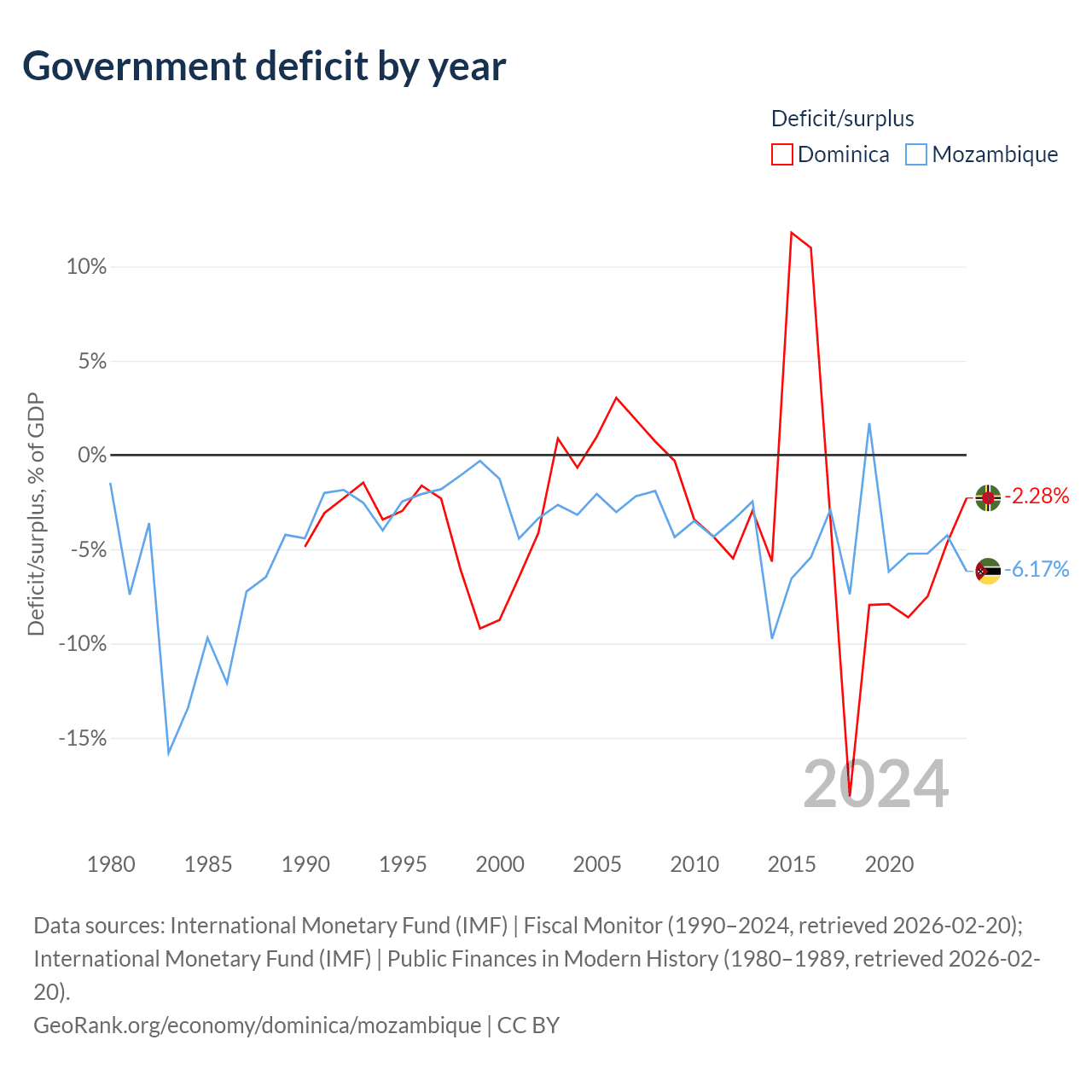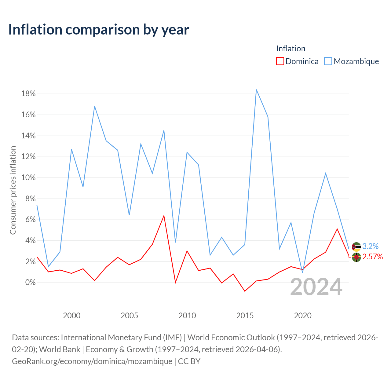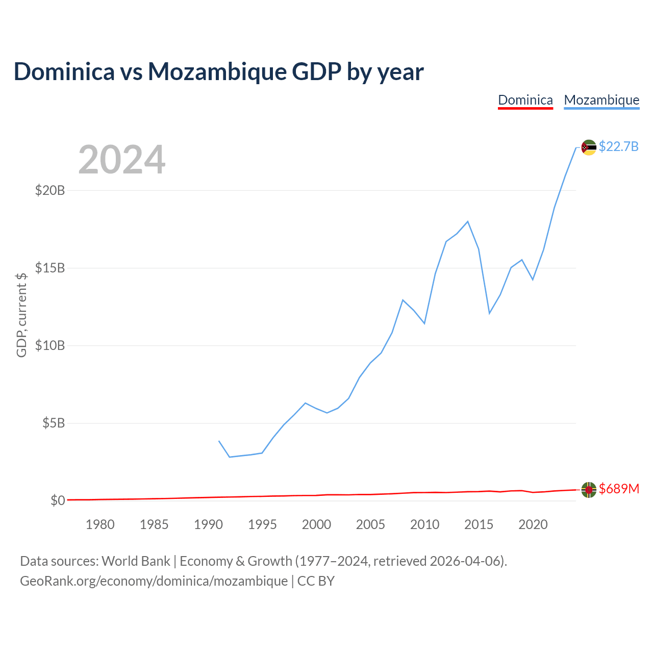 Dominica has a GDP of $689M compared to $22.7B for Mozambique, ranking 190/197 and 123/197 by economy size, respectively.