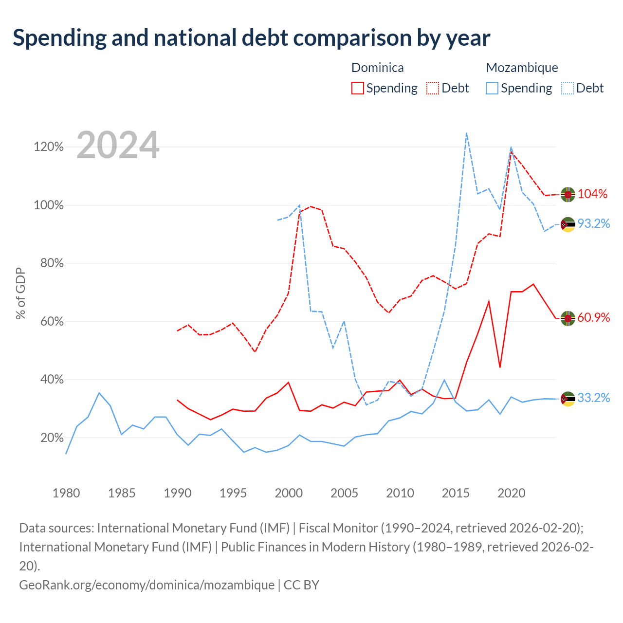 Dominica has $713M in government debt (103.5% of GDP), compared to $21.2B (93.2% of GDP) in Mozambique.