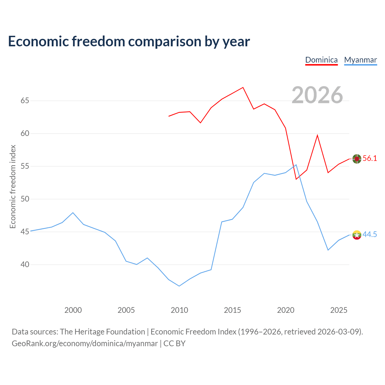 The Economic Freedom Index for Dominica is 56.1, ranking 124/197, compared to 44.5 for Myanmar, ranking 180/197. The chart above displays a comparison of annual changes in economic freedom indexes.