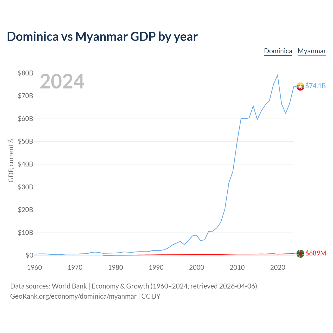 Dominica has a GDP of $689M compared to $74.1B for Myanmar, ranking 190/197 and 85/197 by economy size, respectively.