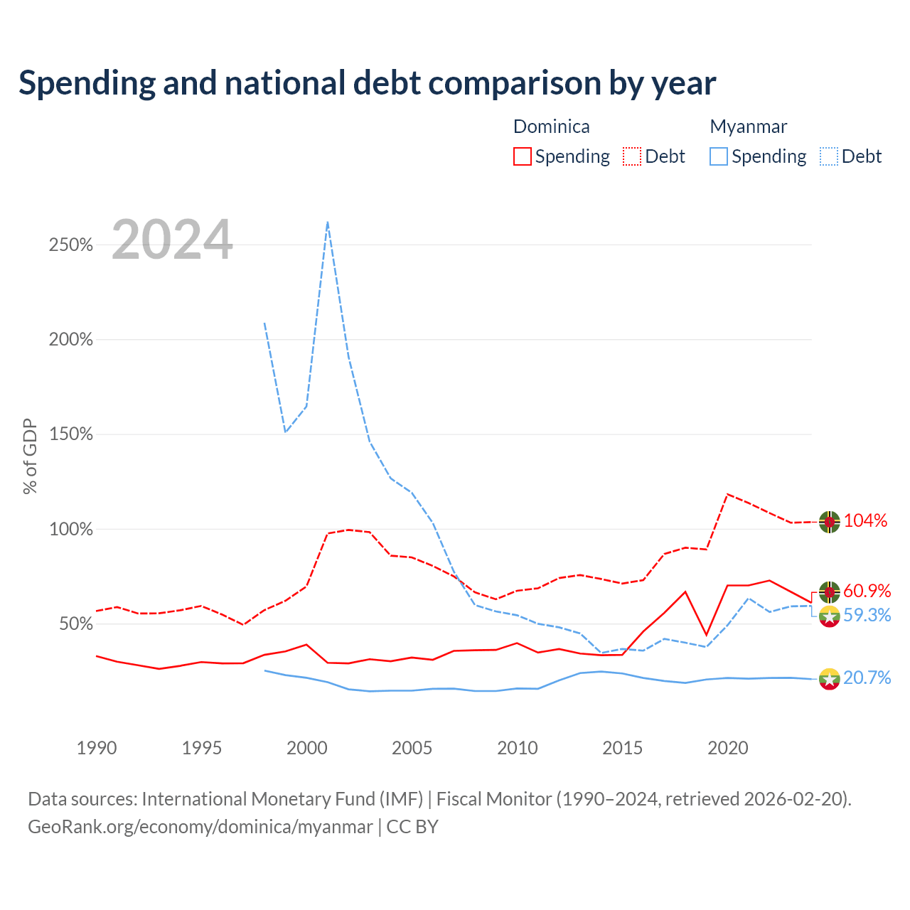 Dominica has $713M in government debt (103.5% of GDP), compared to $44B (59.3% of GDP) in Myanmar.