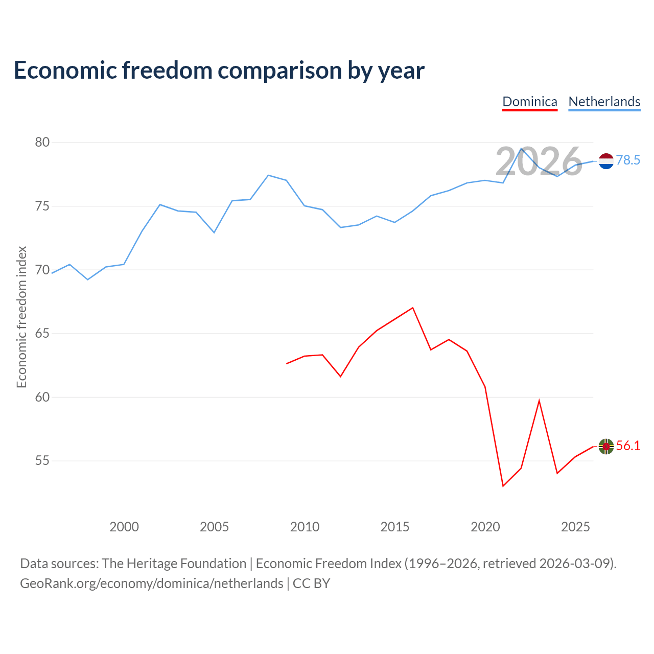 The Economic Freedom Index for Dominica is 56.1, ranking 124/197, compared to 78.5 for the Netherlands, ranking 11/197. The chart above displays a comparison of annual changes in economic freedom indexes.