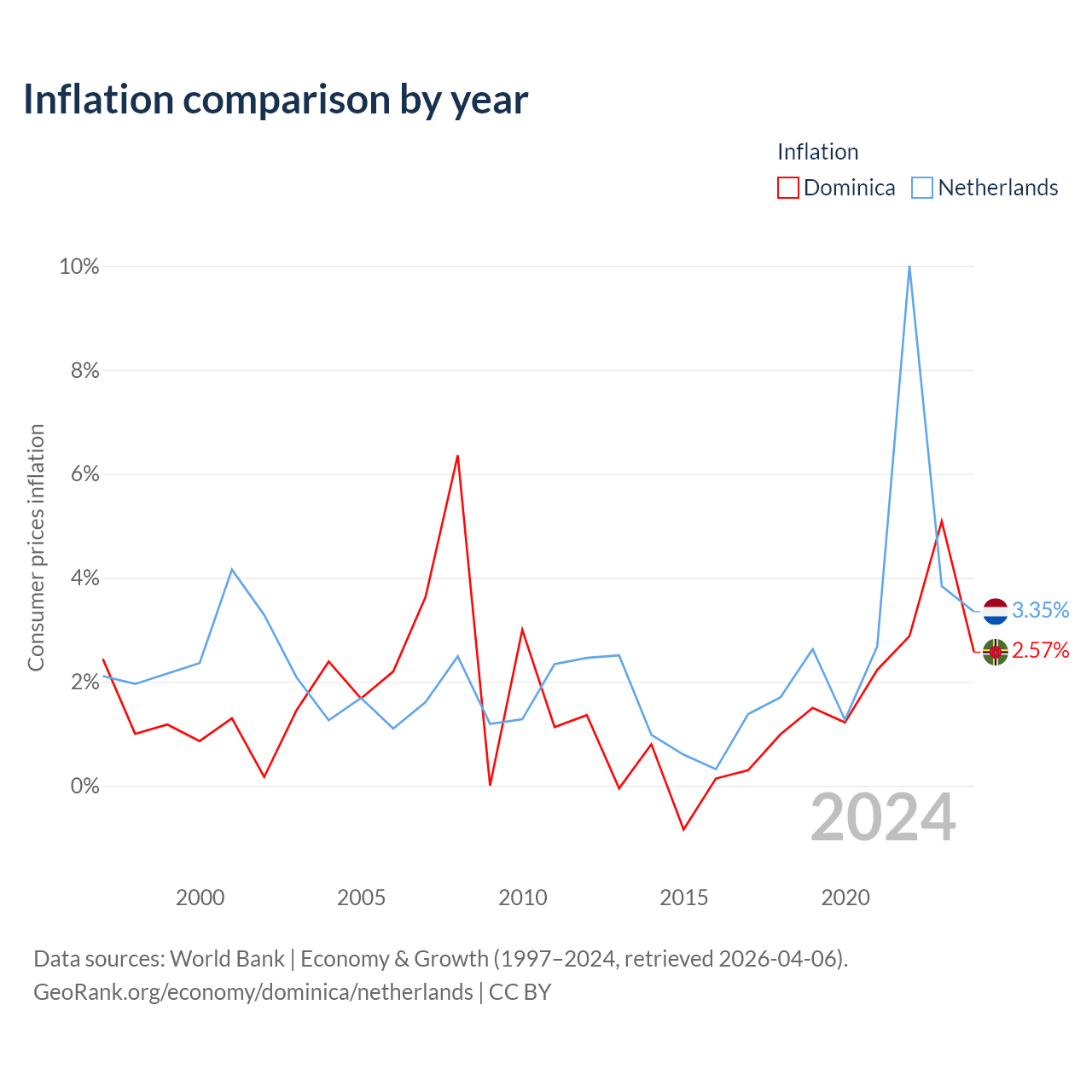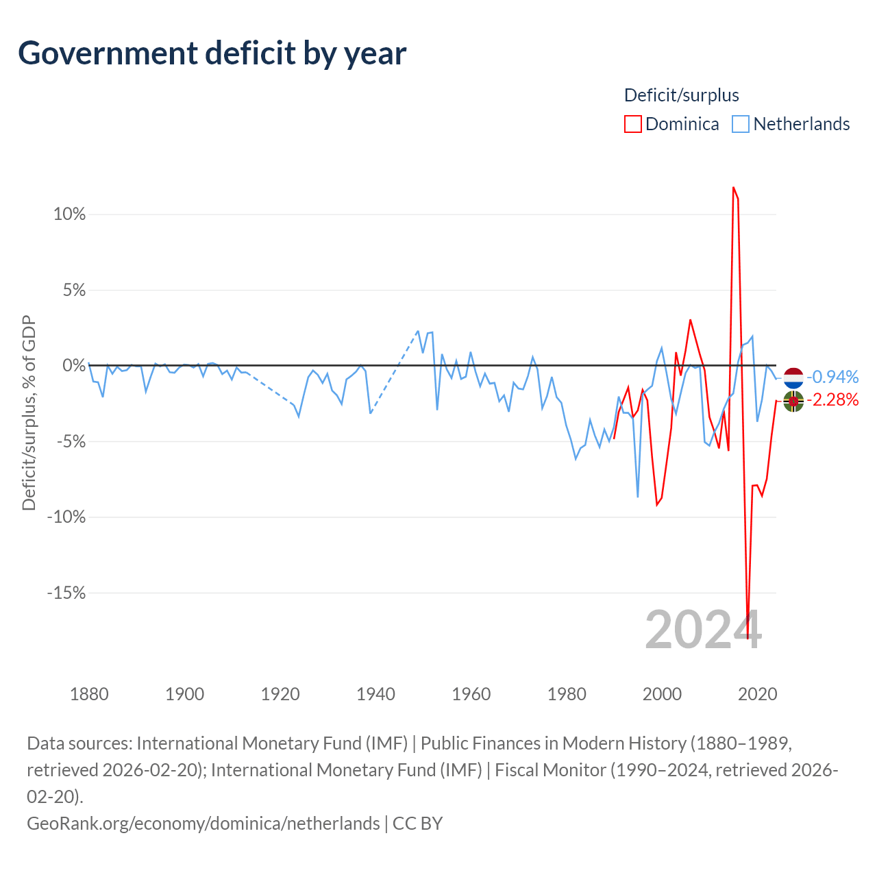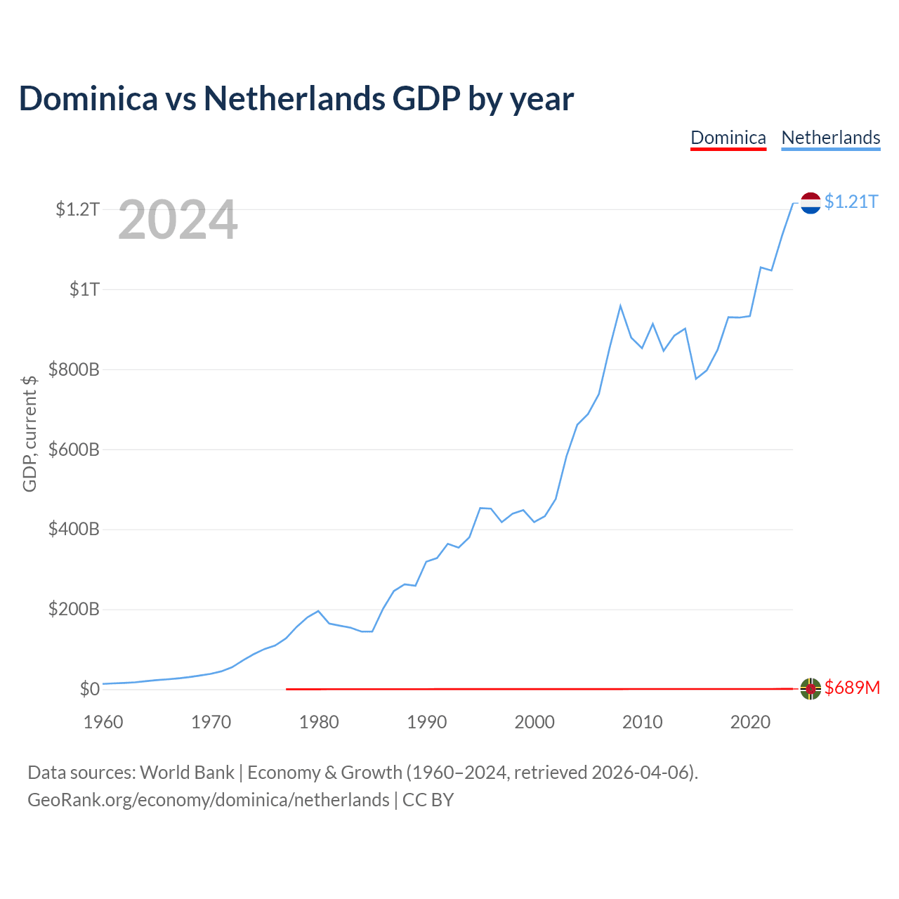 Dominica has a GDP of $689M compared to $1.21T for the Netherlands, ranking 190/197 and 19/197 by economy size, respectively.