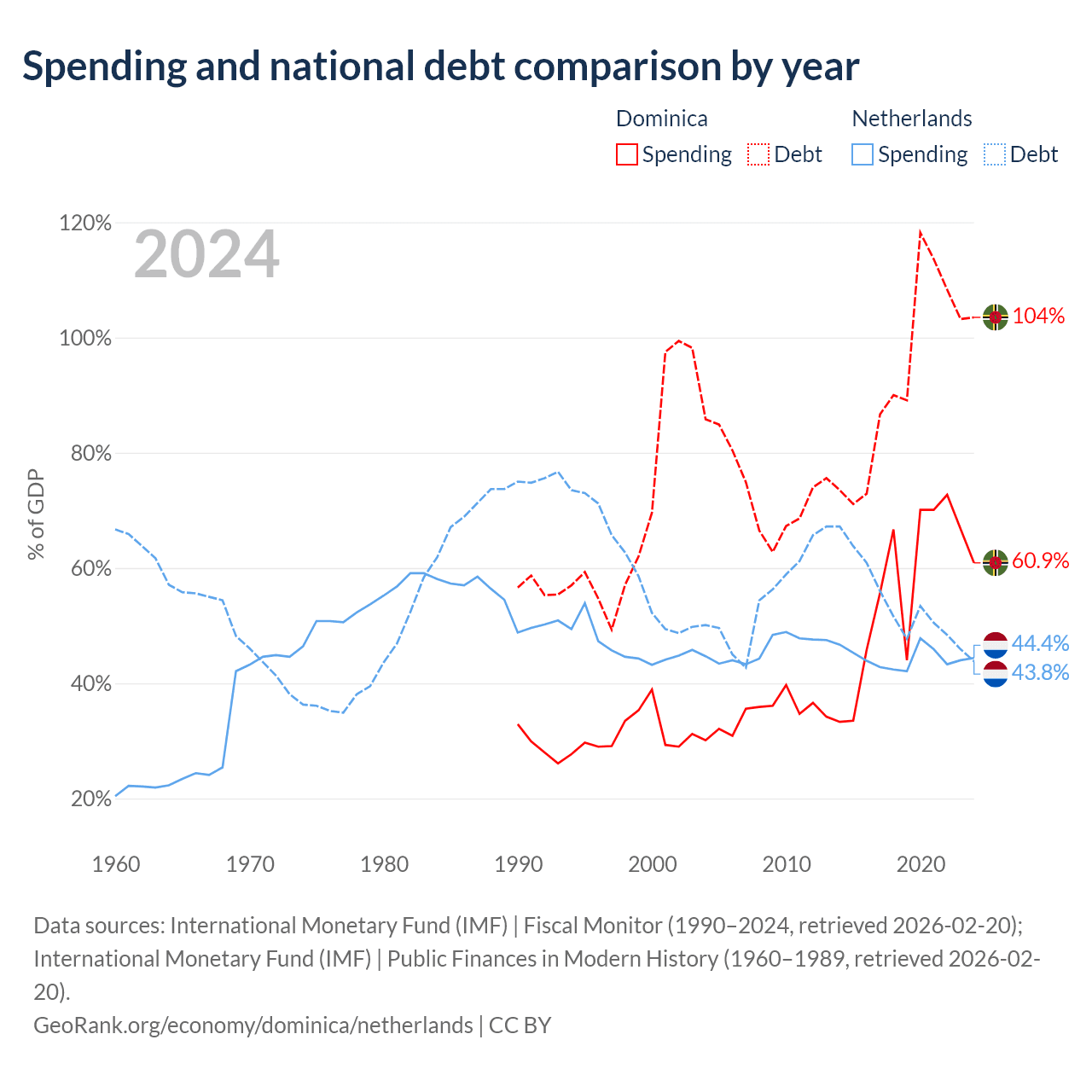 Dominica has $713M in government debt (103.5% of GDP), compared to $532B (43.8% of GDP) in the Netherlands.