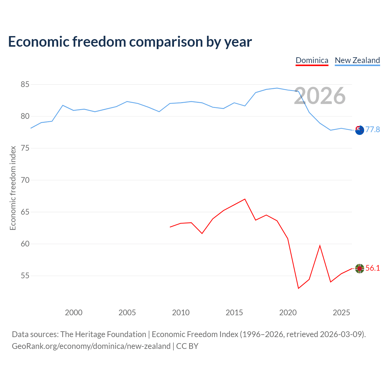The Economic Freedom Index for Dominica is 56.1, ranking 124/197, compared to 77.8 for New Zealand, ranking 13/197. The chart above displays a comparison of annual changes in economic freedom indexes.