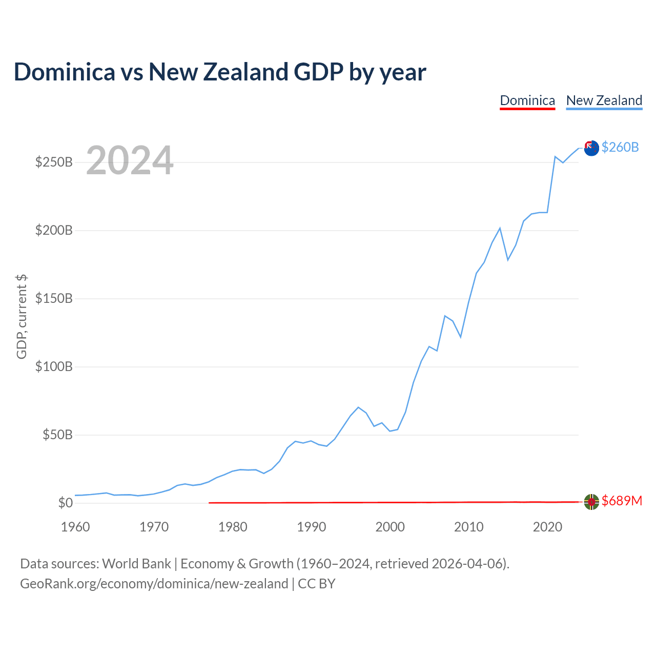 Dominica has a GDP of $689M compared to $260B for New Zealand, ranking 190/197 and 52/197 by economy size, respectively.