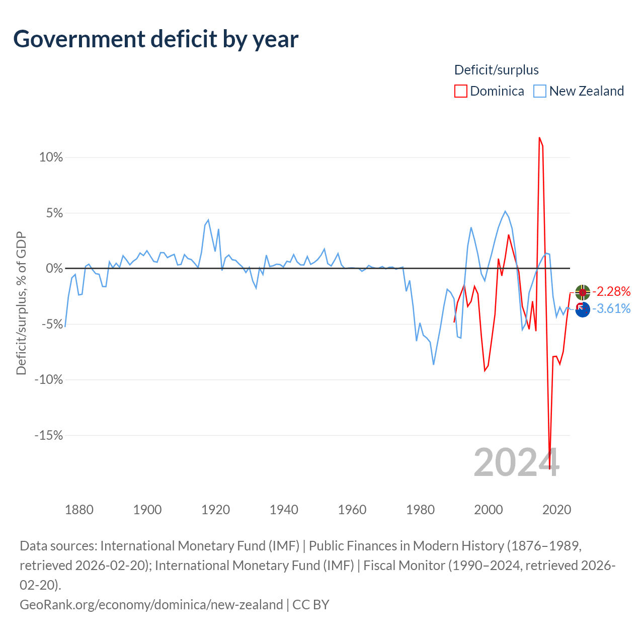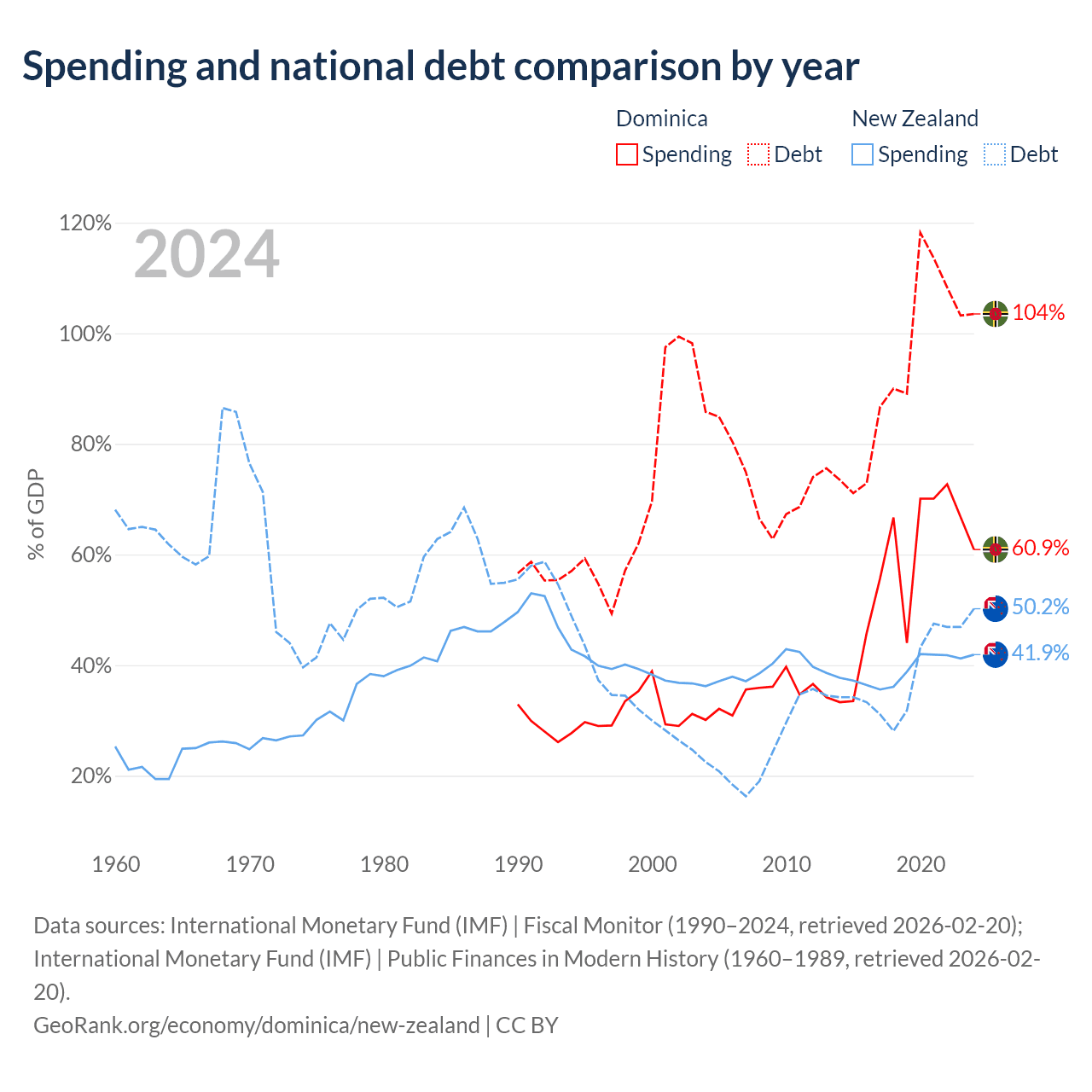 Dominica has $713M in government debt (103.5% of GDP), compared to $131B (50.2% of GDP) in New Zealand.