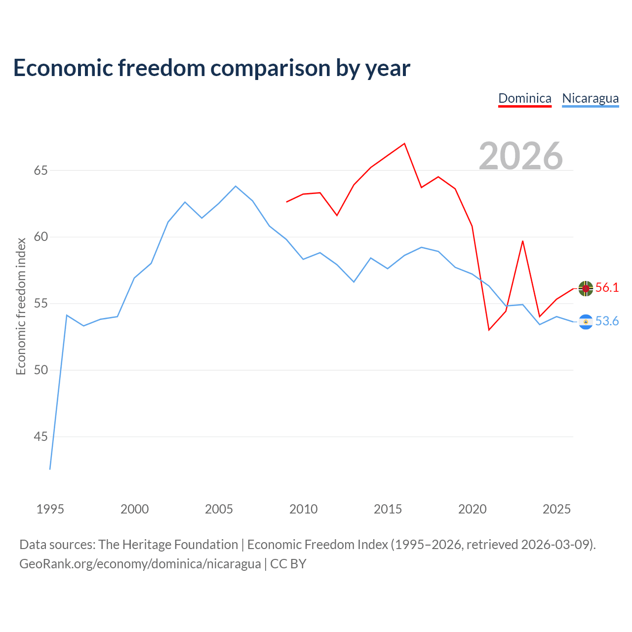 The Economic Freedom Index for Dominica is 56.1, ranking 124/197, compared to 53.6 for Nicaragua, ranking 139/197. The chart above displays a comparison of annual changes in economic freedom indexes.