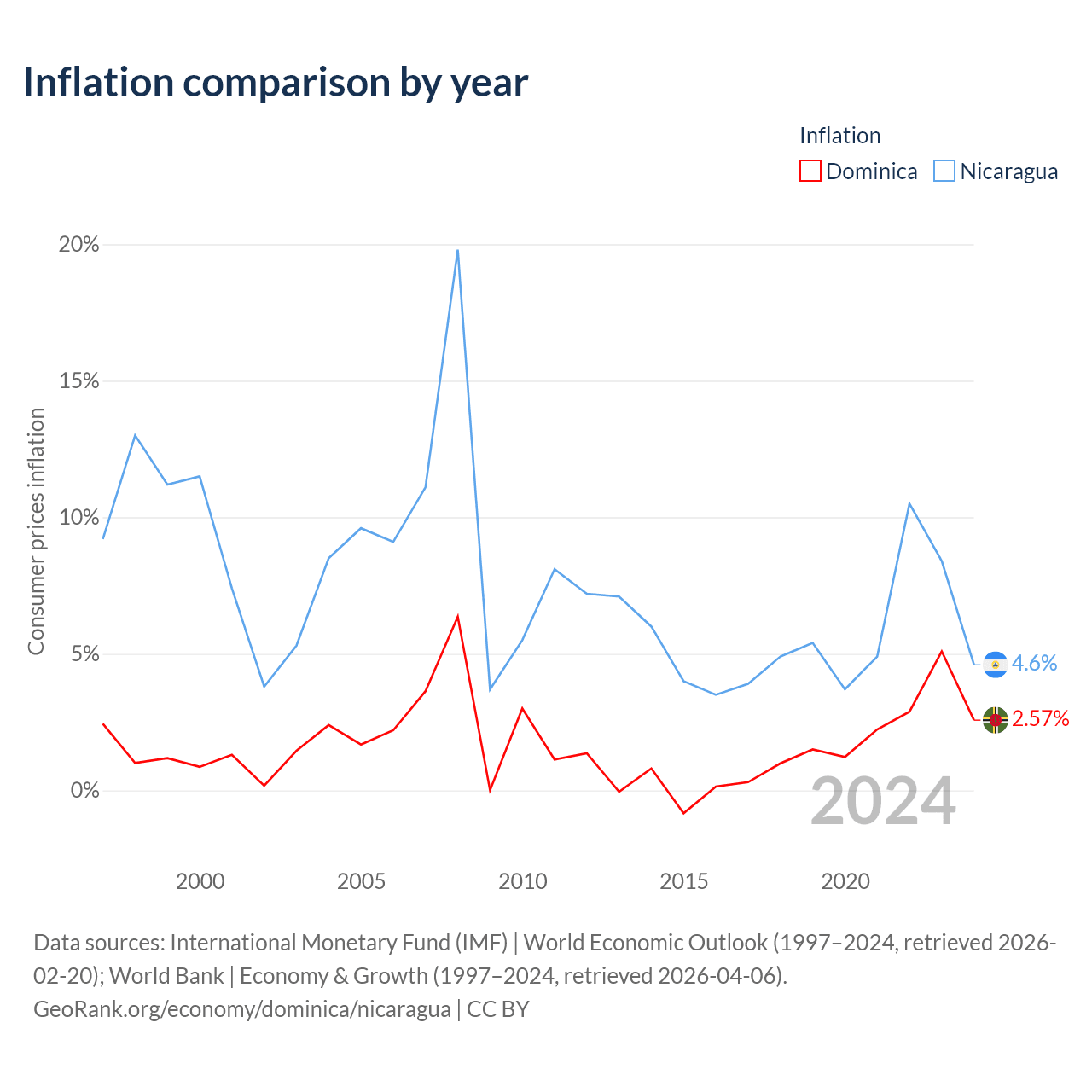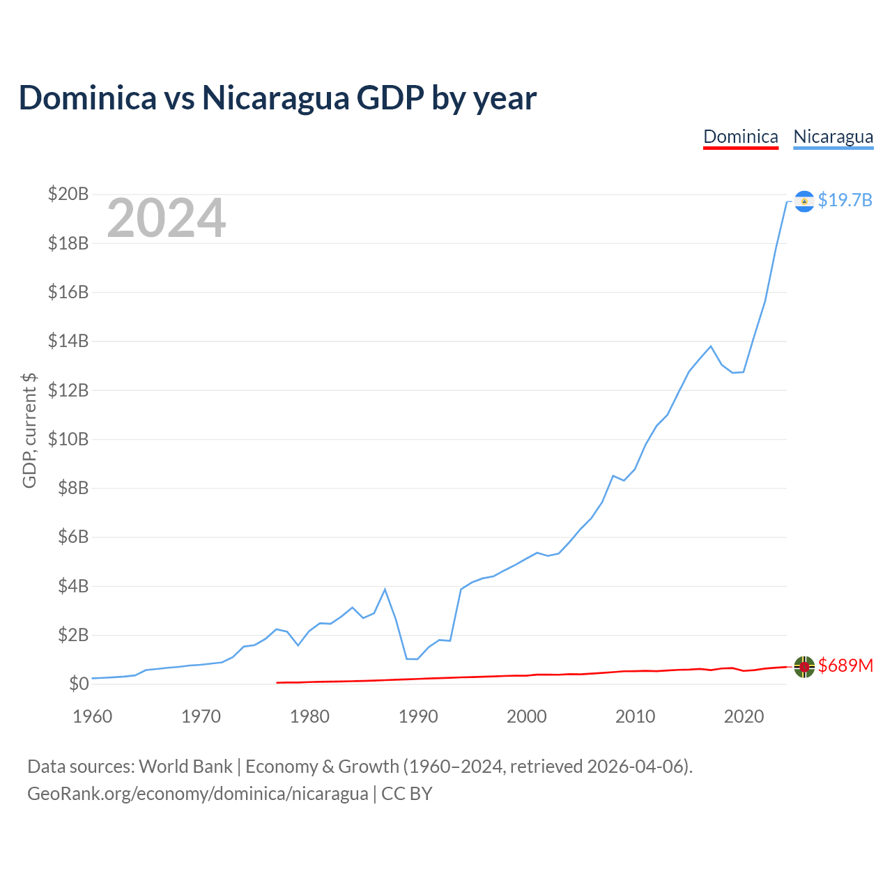 Dominica has a GDP of $689M compared to $19.7B for Nicaragua, ranking 190/197 and 131/197 by economy size, respectively.