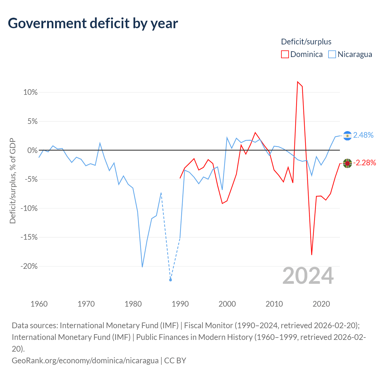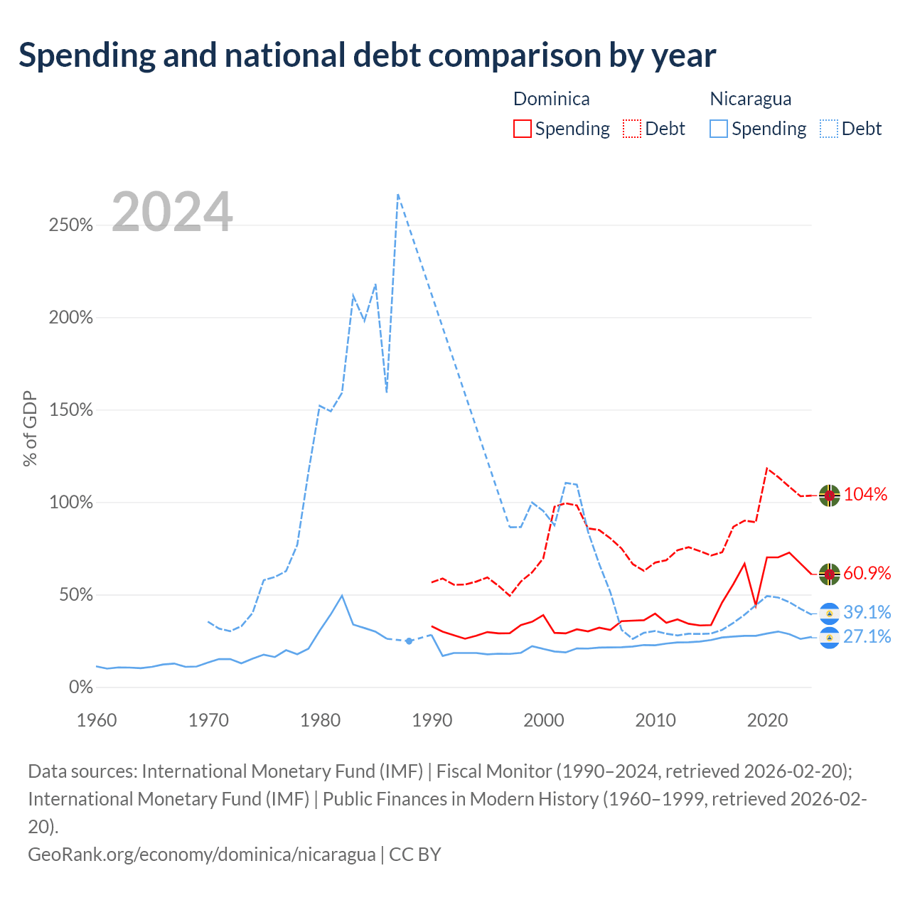 Dominica has $713M in government debt (103.5% of GDP), compared to $7.71B (39.1% of GDP) in Nicaragua.