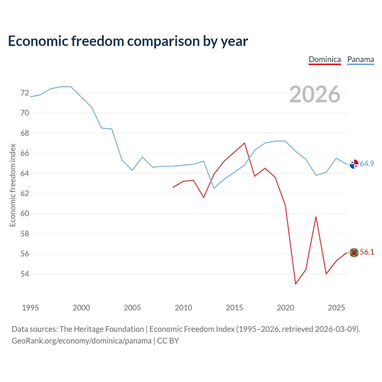 The Economic Freedom Index for Dominica is 56.1, ranking 124/197, compared to 64.9 for Panama, ranking 70/197. The chart above displays a comparison of annual changes in economic freedom indexes.
