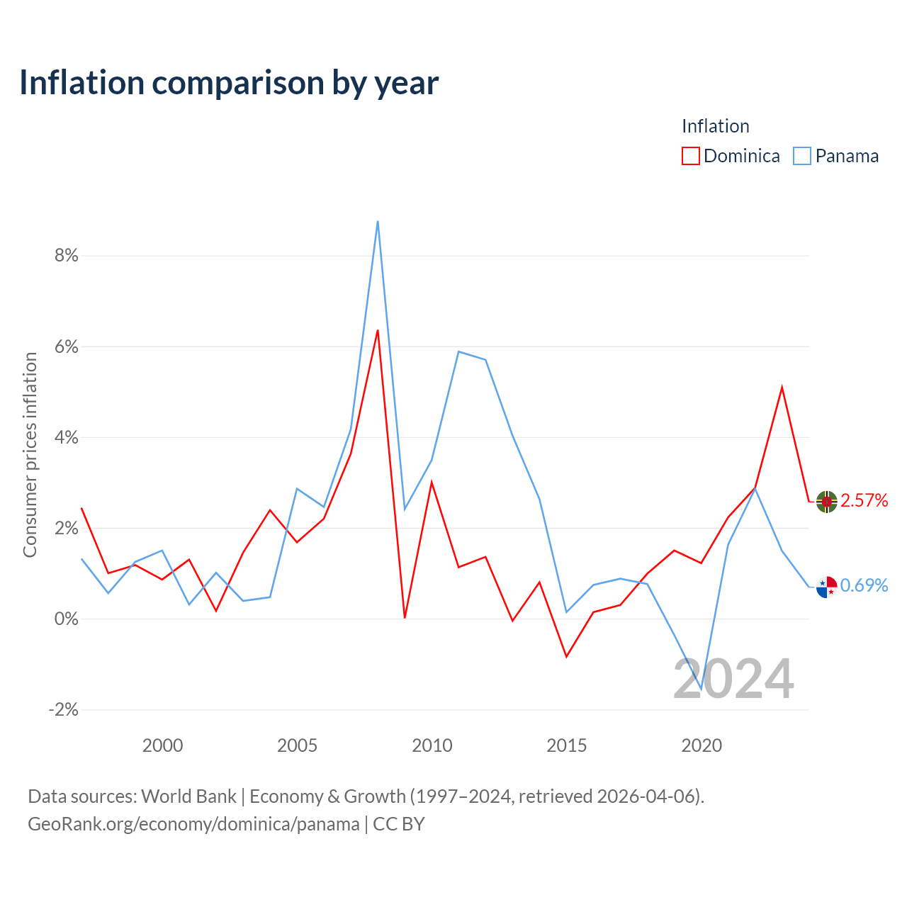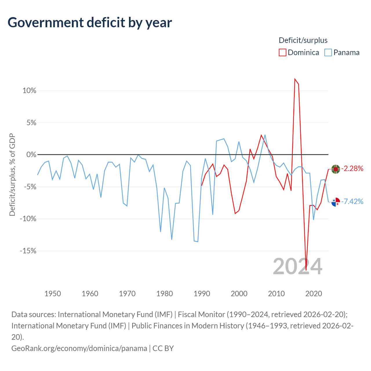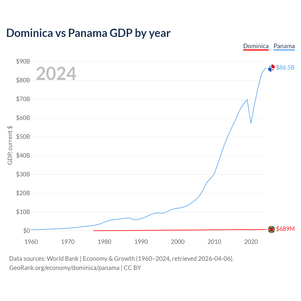 Dominica has a GDP of $689M compared to $86.5B for Panama, ranking 190/197 and 78/197 by economy size, respectively.