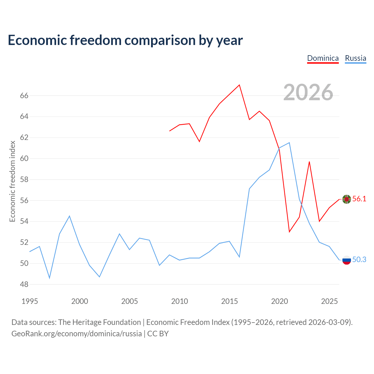 The Economic Freedom Index for Dominica is 56.1, ranking 124/197, compared to 50.3 for Russia, ranking 161/197. The chart above displays a comparison of annual changes in economic freedom indexes.