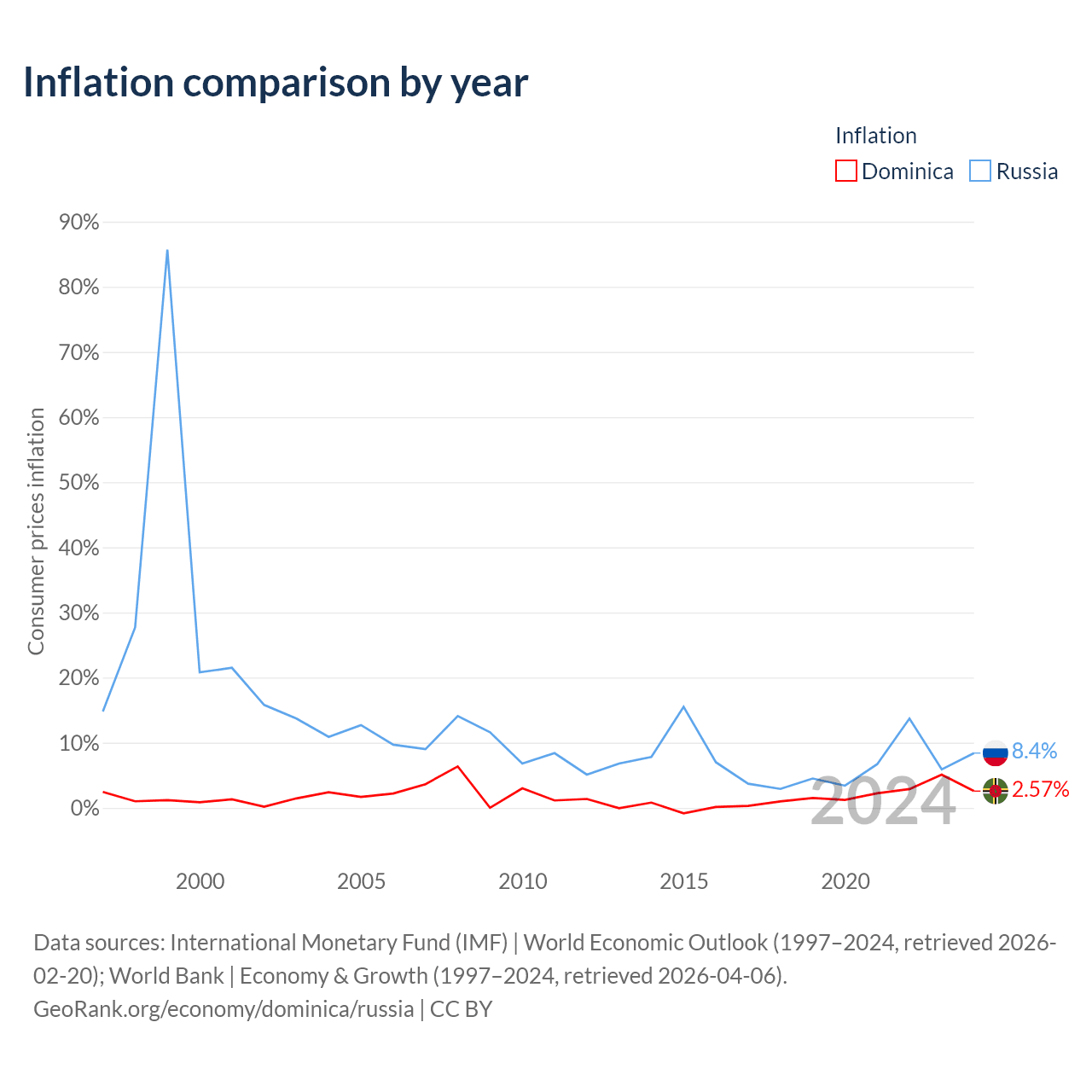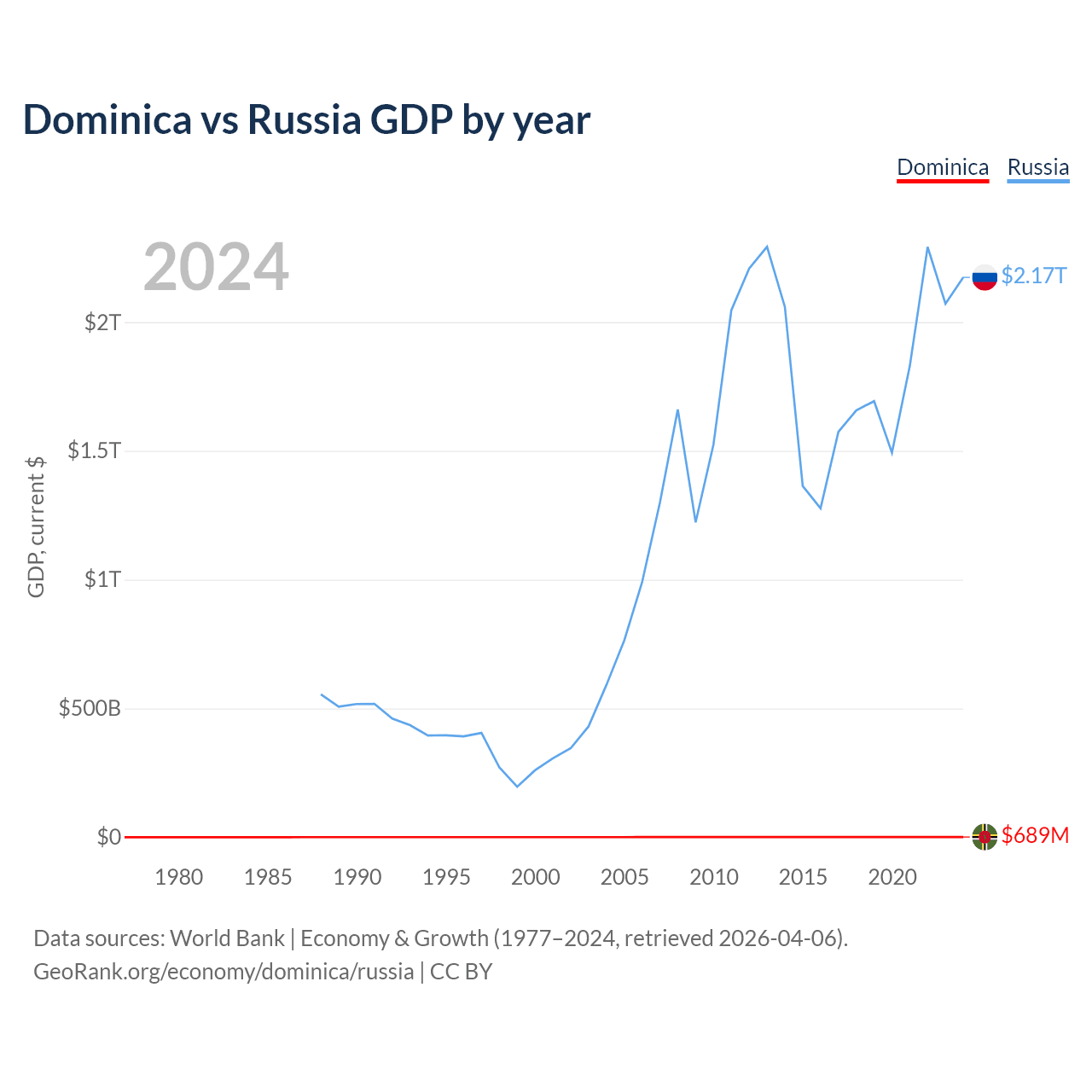 Dominica has a GDP of $689M compared to $2.17T for Russia, ranking 190/197 and 11/197 by economy size, respectively.