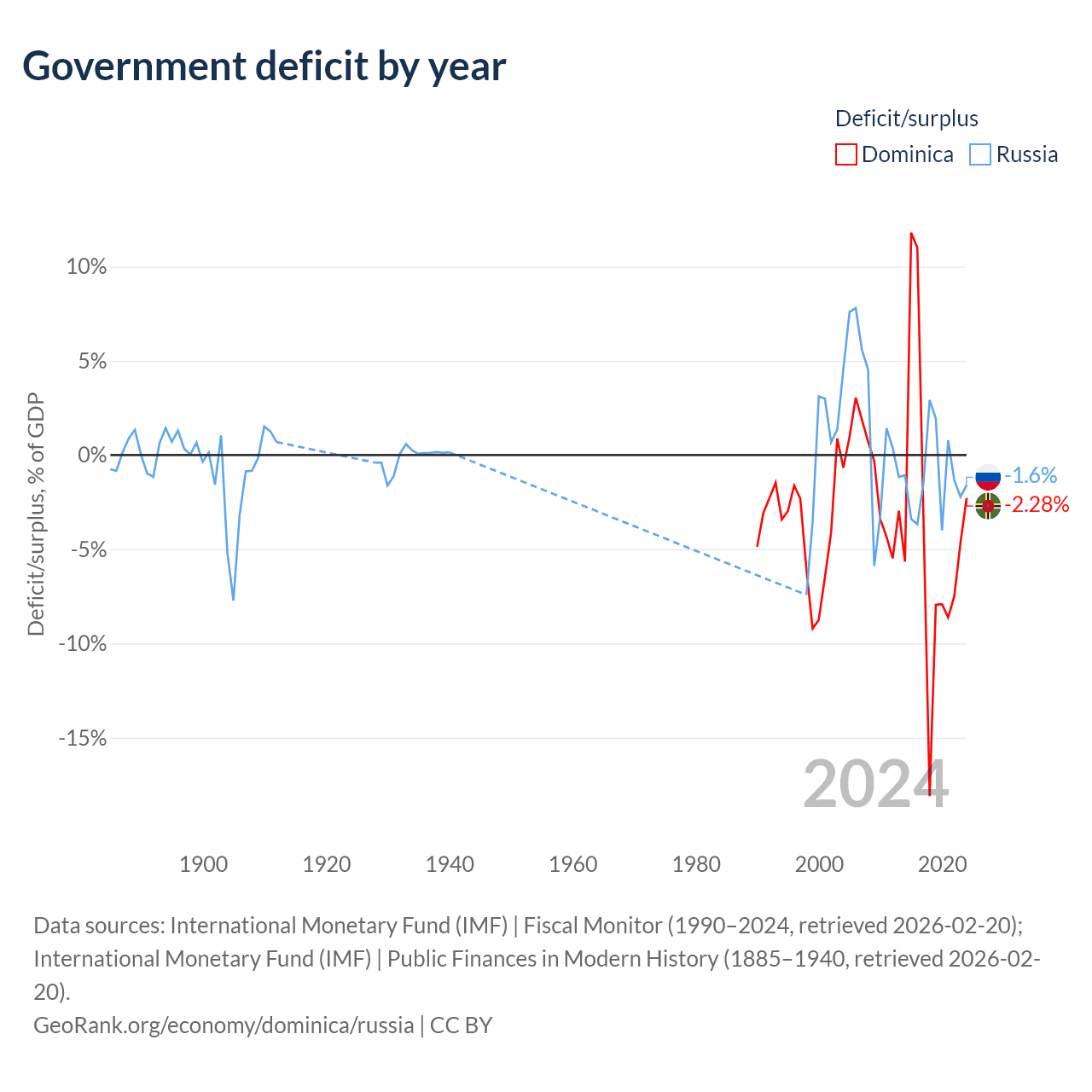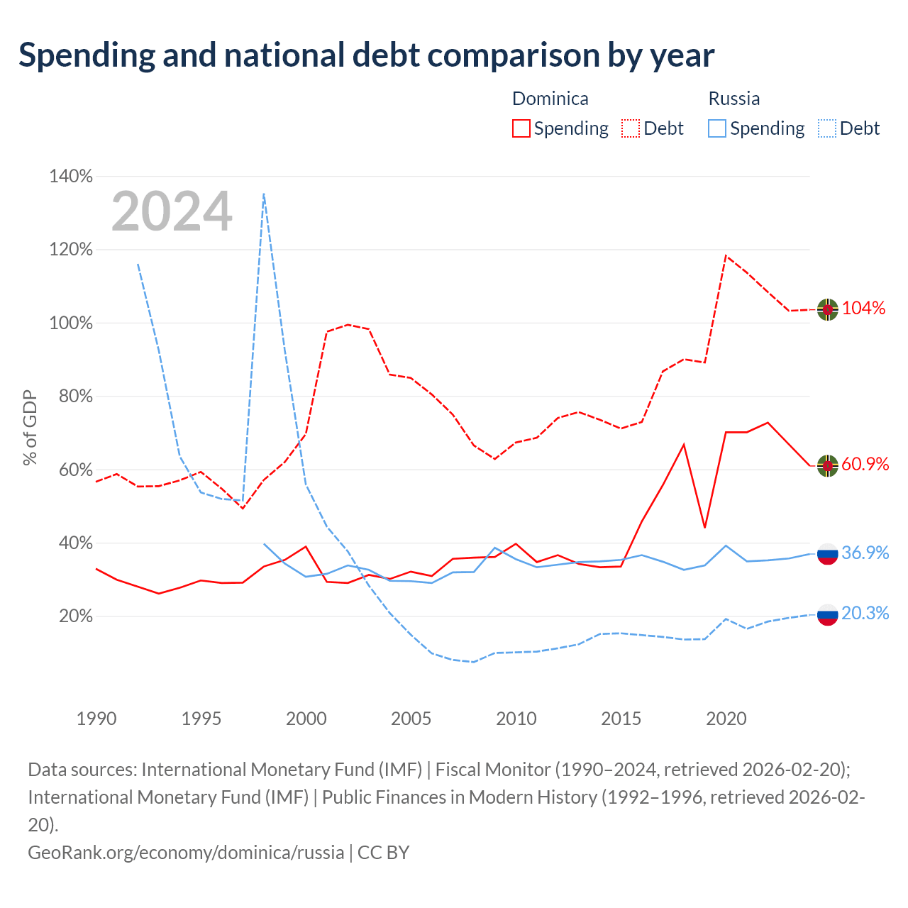 Dominica has $713M in government debt (103.5% of GDP), compared to $440B (20.3% of GDP) in Russia.