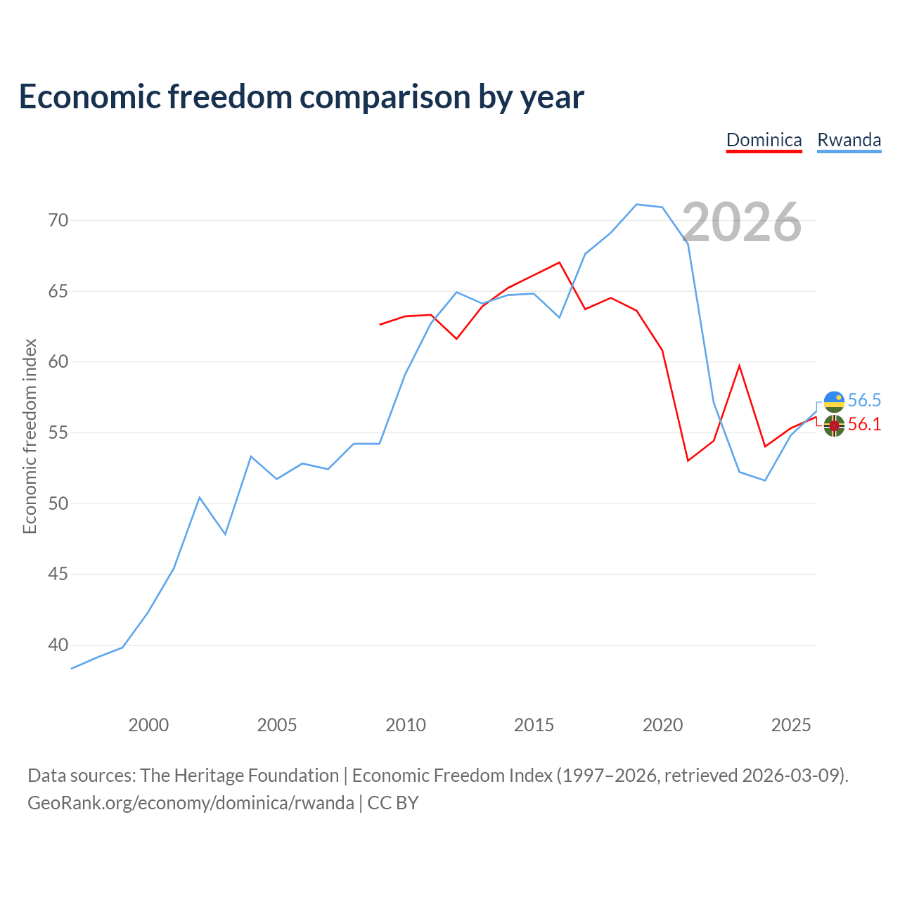 The Economic Freedom Index for Dominica is 56.1, ranking 124/197, compared to 56.5 for Rwanda, ranking 121/197. The chart above displays a comparison of annual changes in economic freedom indexes.