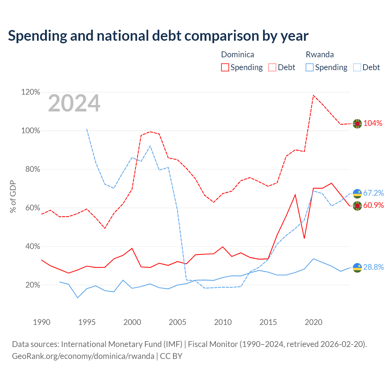 Dominica has $713M in government debt (103.5% of GDP), compared to $9.58B (67.2% of GDP) in Rwanda.