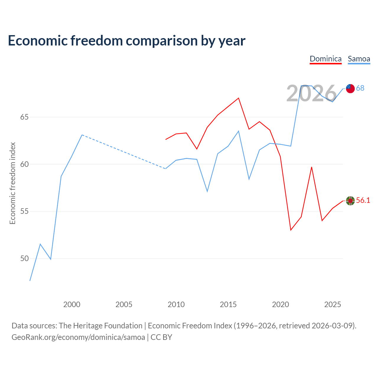 The Economic Freedom Index for Dominica is 56.1, ranking 124/197, compared to 68 for Samoa, ranking 52/197. The chart above displays a comparison of annual changes in economic freedom indexes.