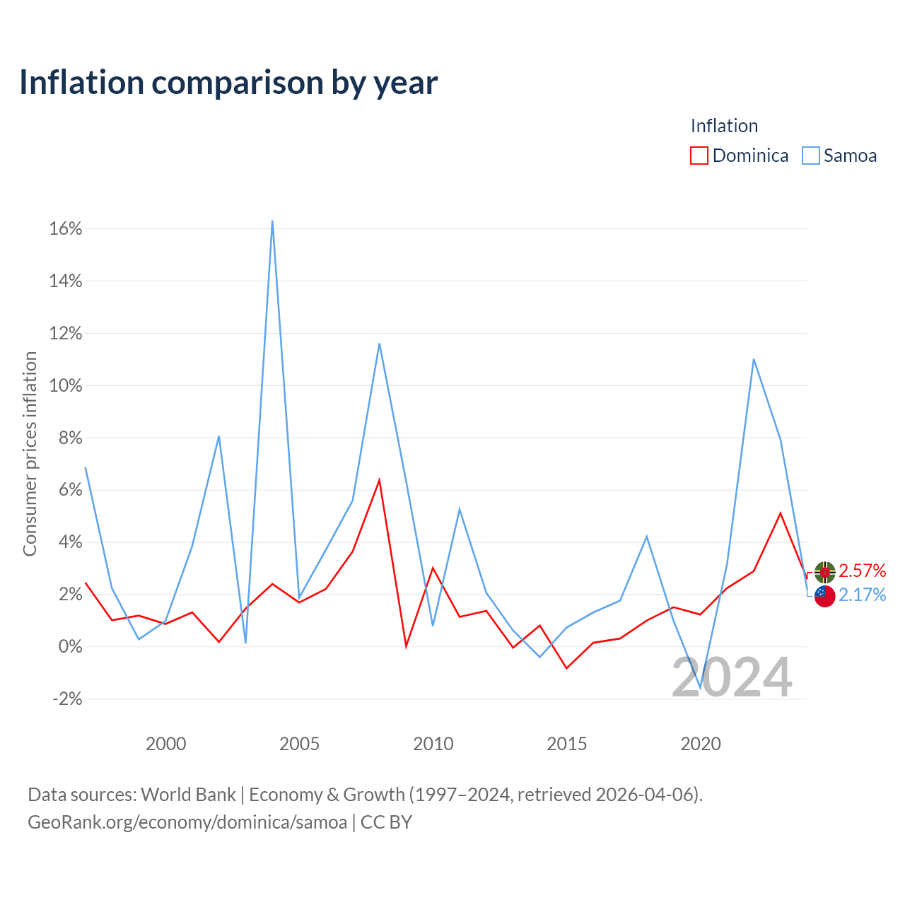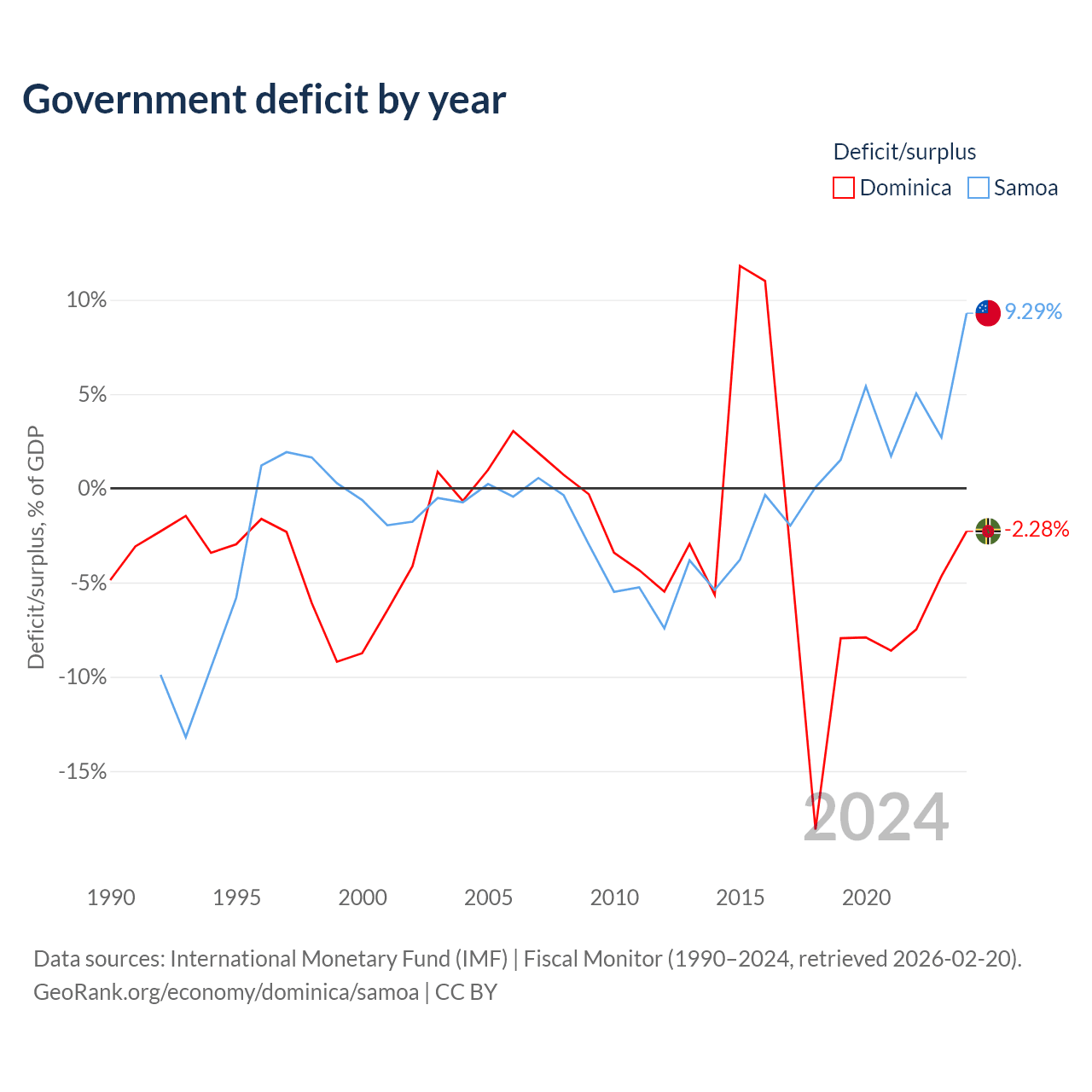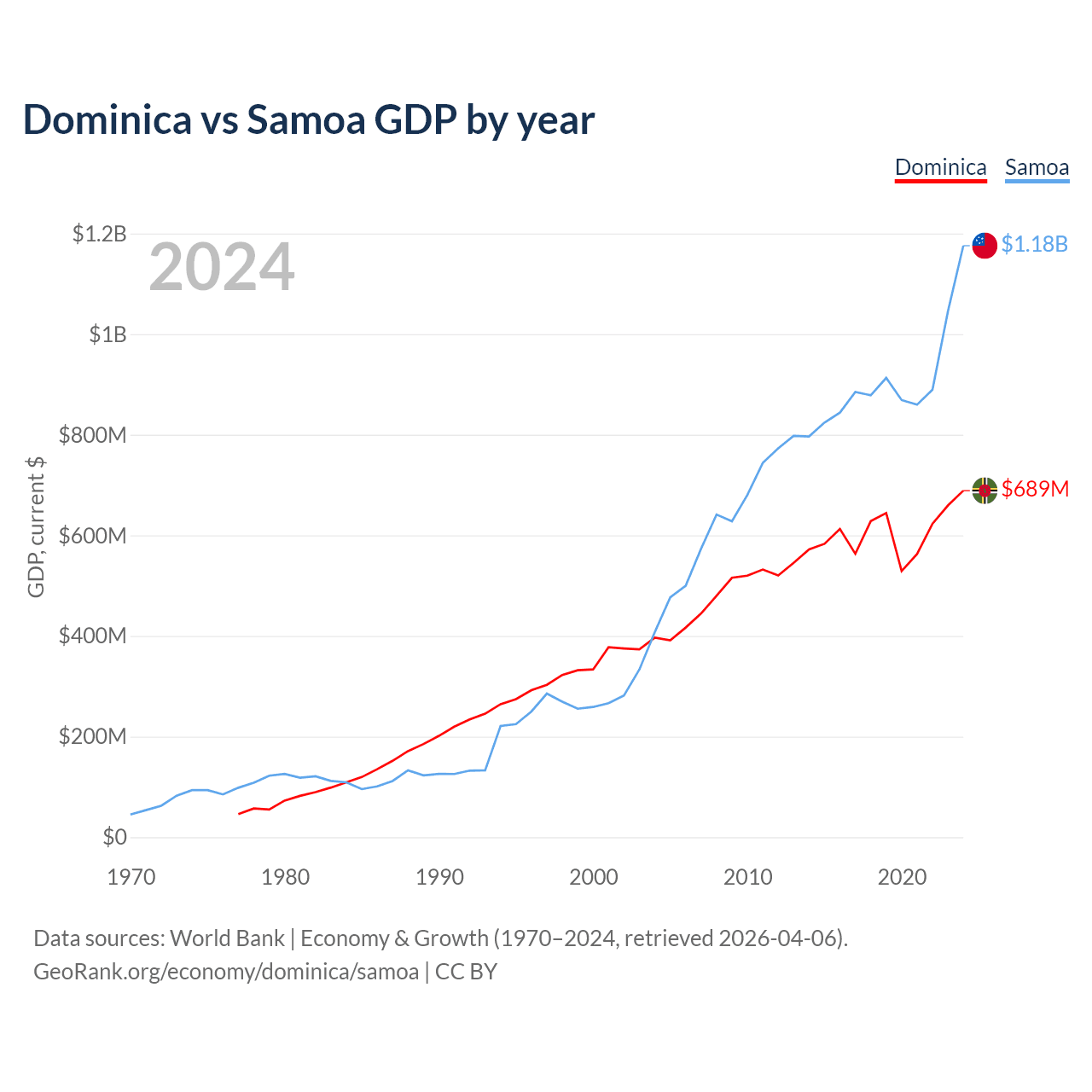 Dominica has a GDP of $689M compared to $1.18B for Samoa, ranking 190/197 and 185/197 by economy size, respectively.