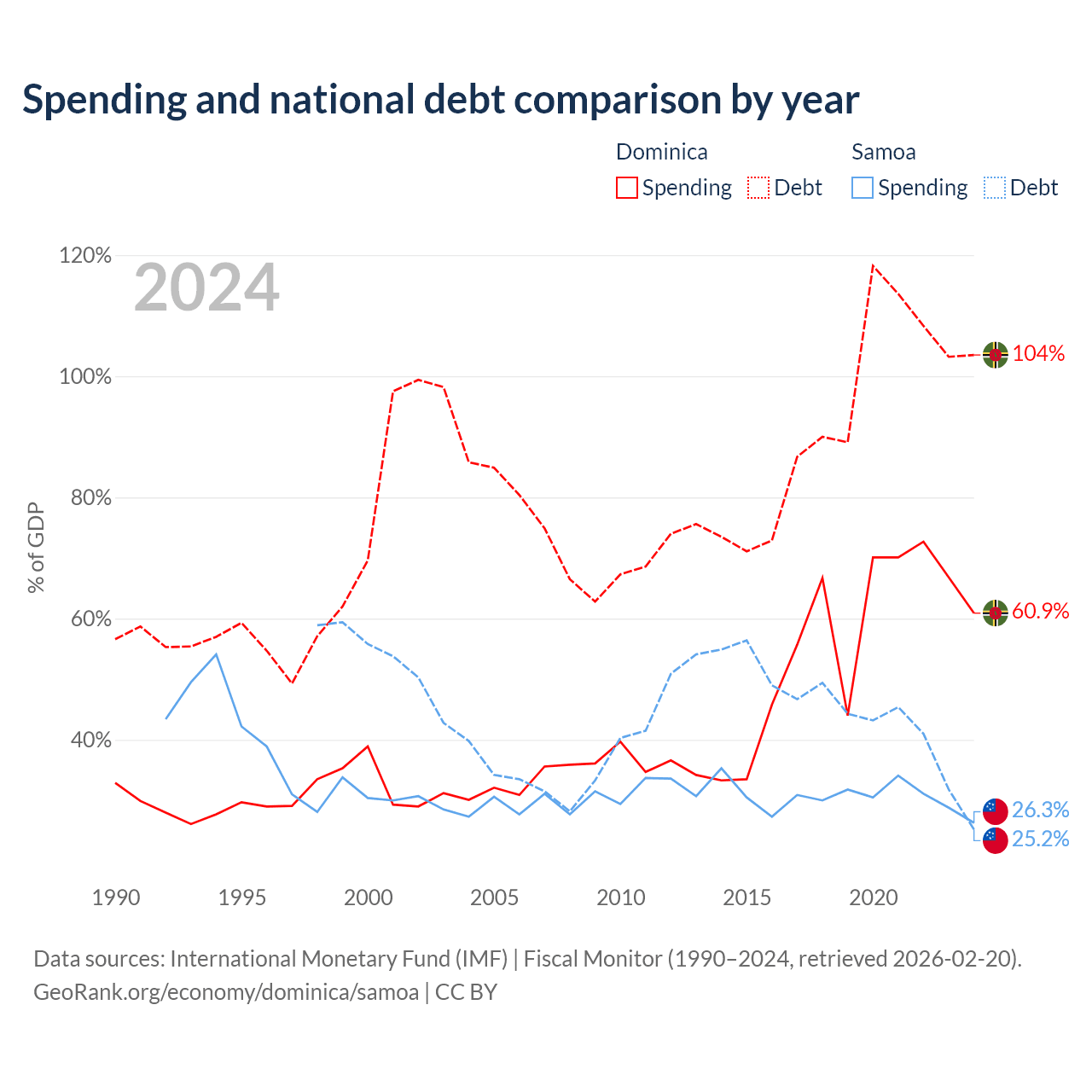 Dominica has $713M in government debt (103.5% of GDP), compared to $296M (25.2% of GDP) in Samoa.