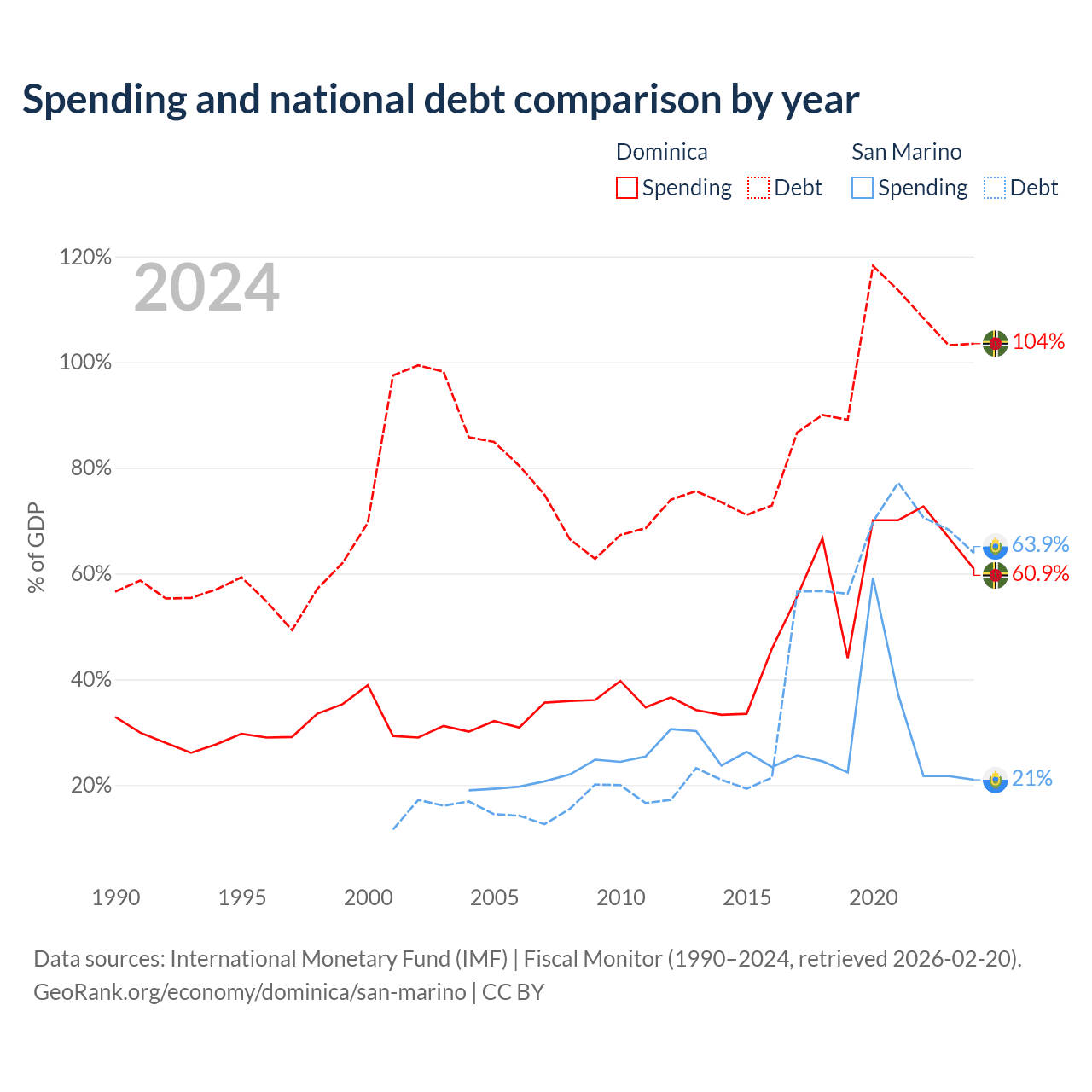 Dominica has $713M in government debt (103.5% of GDP), compared to $1.39B (63.9% of GDP) in San Marino.