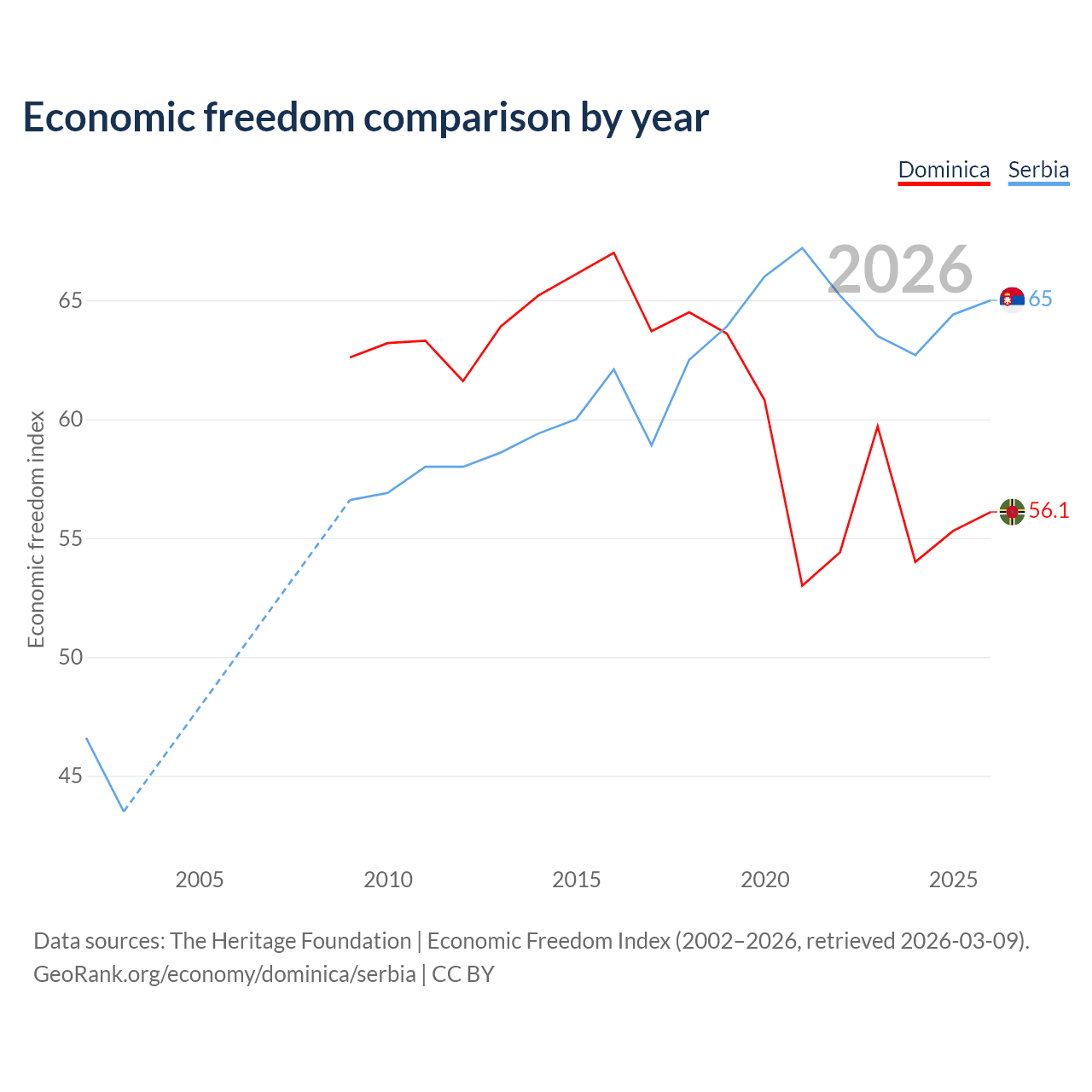 The Economic Freedom Index for Dominica is 56.1, ranking 124/197, compared to 65 for Serbia, ranking 68/197. The chart above displays a comparison of annual changes in economic freedom indexes.
