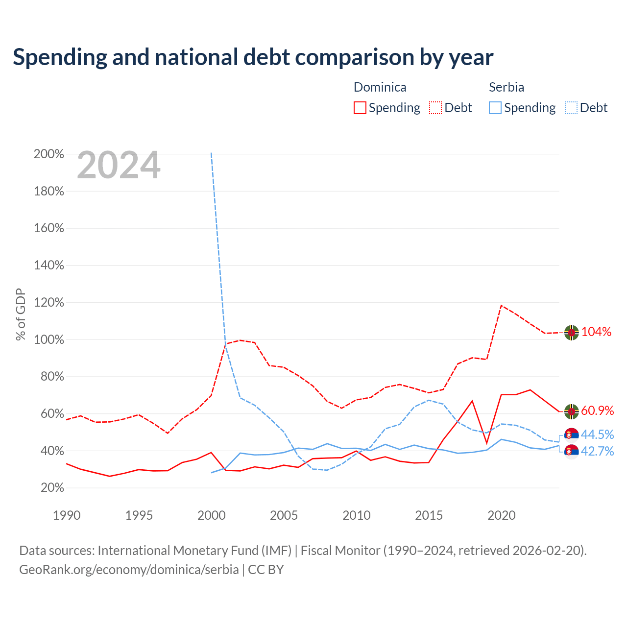 Dominica has $713M in government debt (103.5% of GDP), compared to $40.1B (44.5% of GDP) in Serbia.