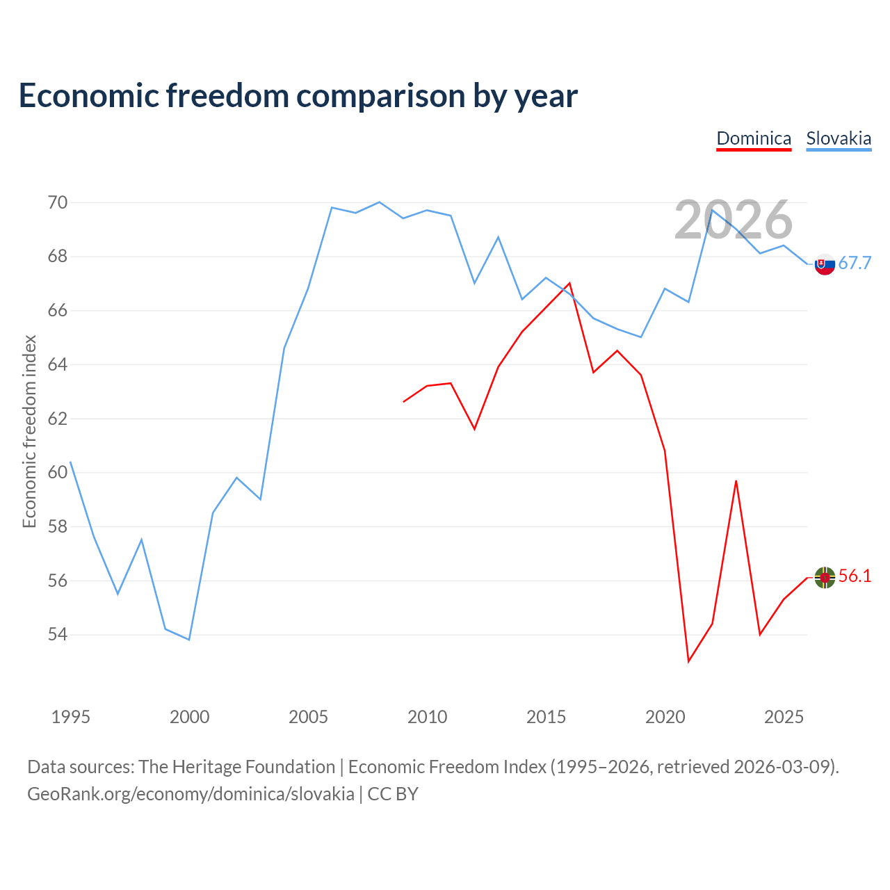 The Economic Freedom Index for Dominica is 56.1, ranking 124/197, compared to 67.7 for Slovakia, ranking 54/197. The chart above displays a comparison of annual changes in economic freedom indexes.