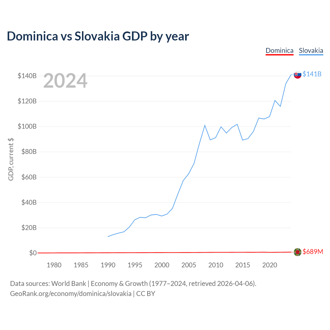 Dominica has a GDP of $689M compared to $141B for Slovakia, ranking 190/197 and 61/197 by economy size, respectively.