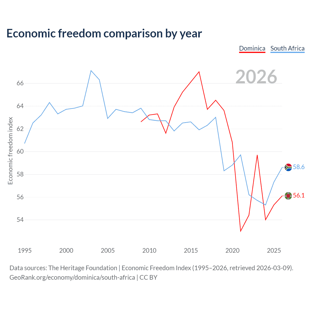 The Economic Freedom Index for Dominica is 56.1, ranking 124/197, compared to 58.6 for South Africa, ranking 110/197. The chart above displays a comparison of annual changes in economic freedom indexes.