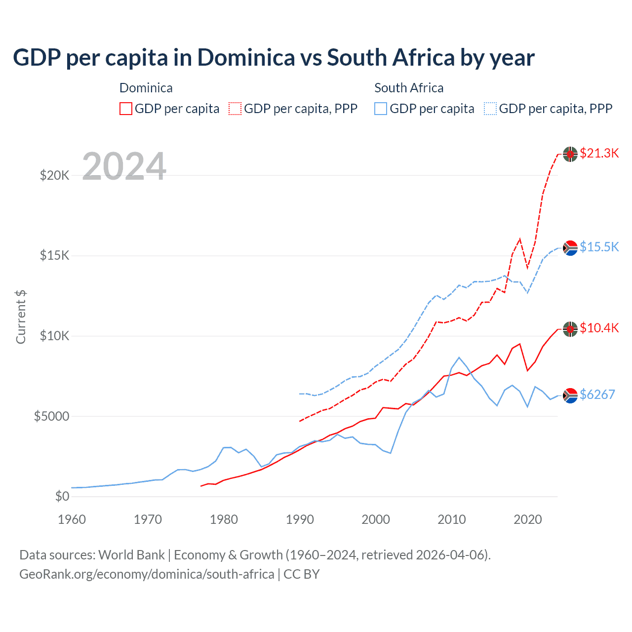 GDP per capita in Dominica vs South Africa by year