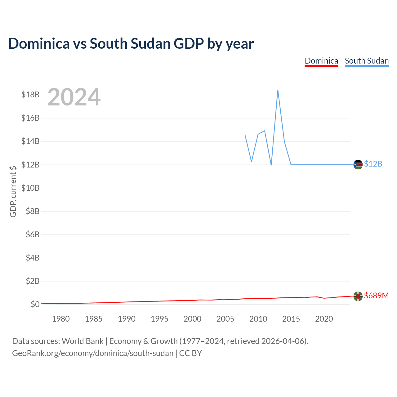 Dominica has a GDP of $689M compared to $12B for South Sudan, ranking 190/197 and 149/197 by economy size, respectively.