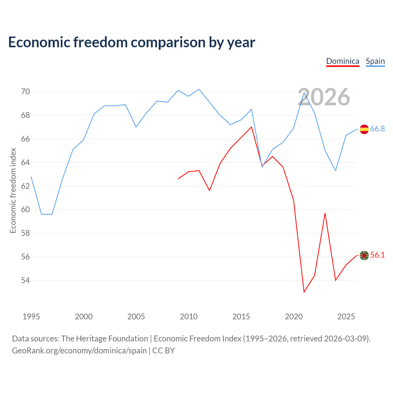 The Economic Freedom Index for Dominica is 56.1, ranking 124/197, compared to 66.8 for Spain, ranking 59/197. The chart above displays a comparison of annual changes in economic freedom indexes.