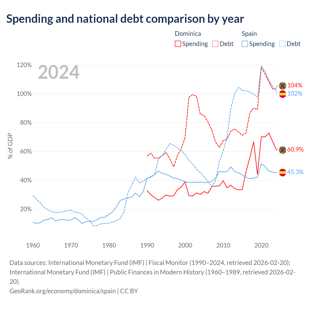 Dominica has $713M in government debt (103.5% of GDP), compared to $1.75T (101.6% of GDP) in Spain.