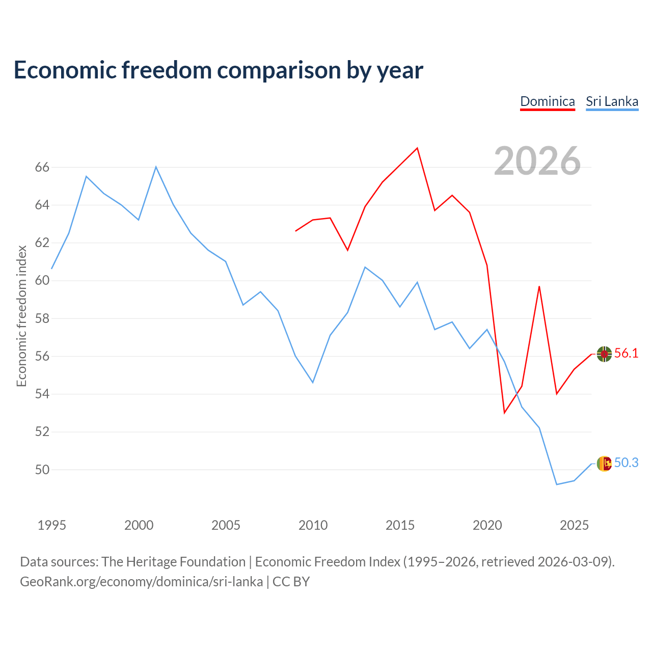 The Economic Freedom Index for Dominica is 56.1, ranking 124/197, compared to 50.3 for Sri Lanka, ranking 162/197. The chart above displays a comparison of annual changes in economic freedom indexes.