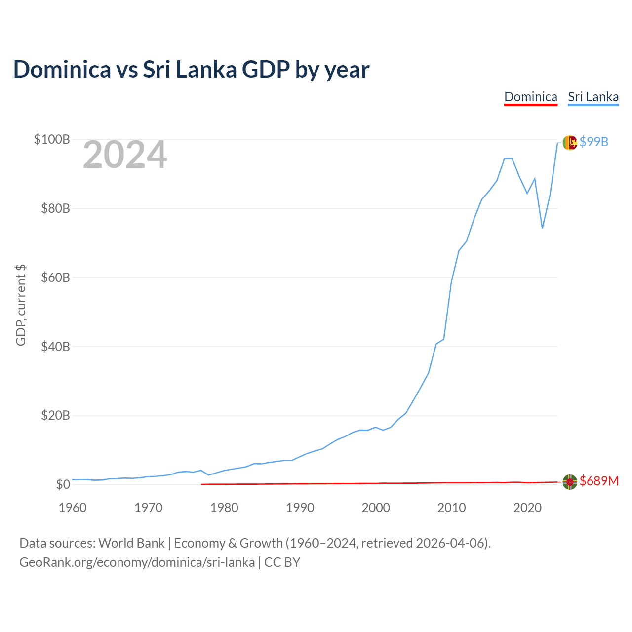 Dominica has a GDP of $689M compared to $99B for Sri Lanka, ranking 190/197 and 72/197 by economy size, respectively.