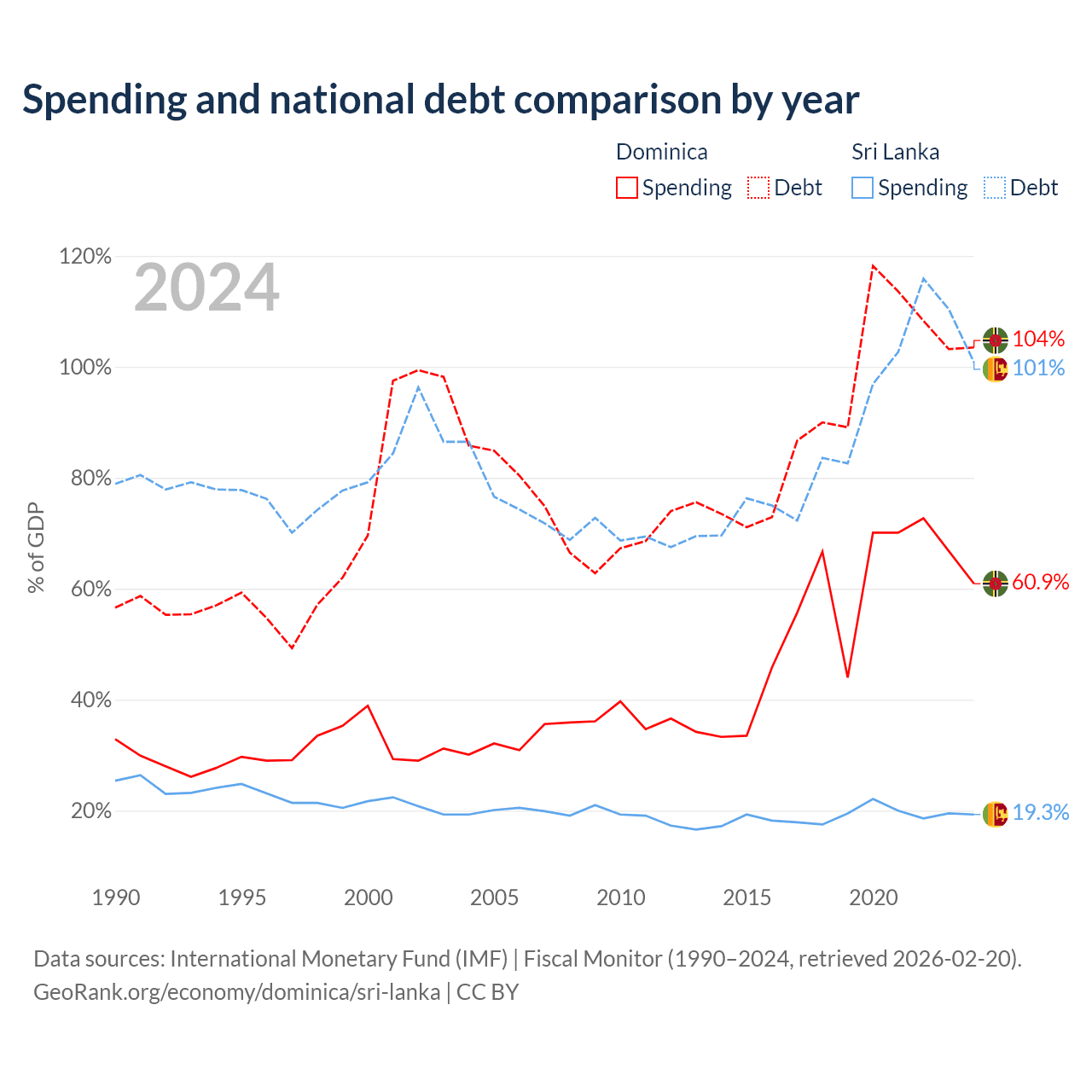 Dominica has $713M in government debt (103.5% of GDP), compared to $99.8B (100.8% of GDP) in Sri Lanka.