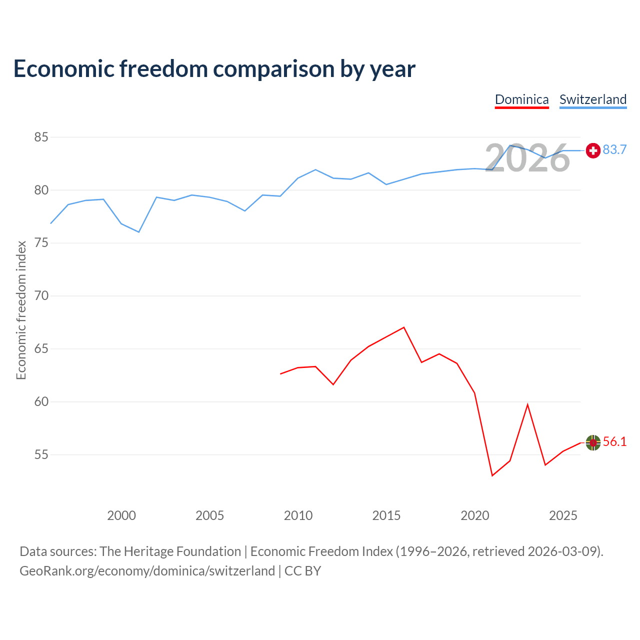 The Economic Freedom Index for Dominica is 56.1, ranking 124/197, compared to 83.7 for Switzerland, ranking 2/197. The chart above displays a comparison of annual changes in economic freedom indexes.