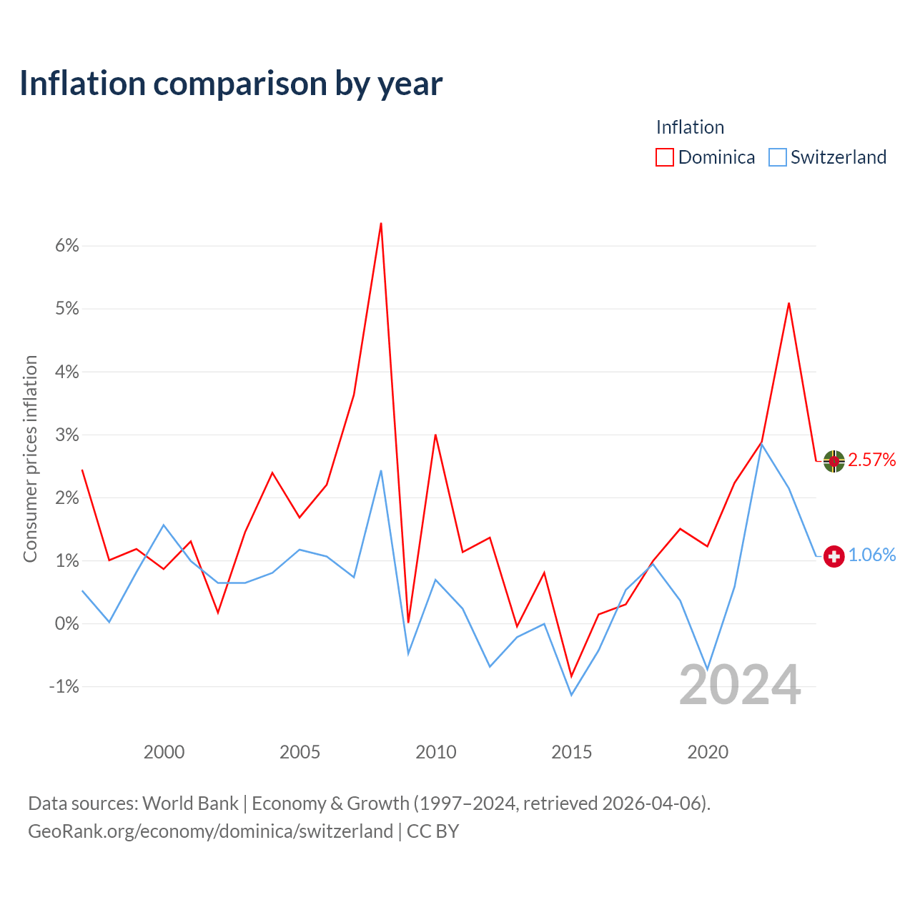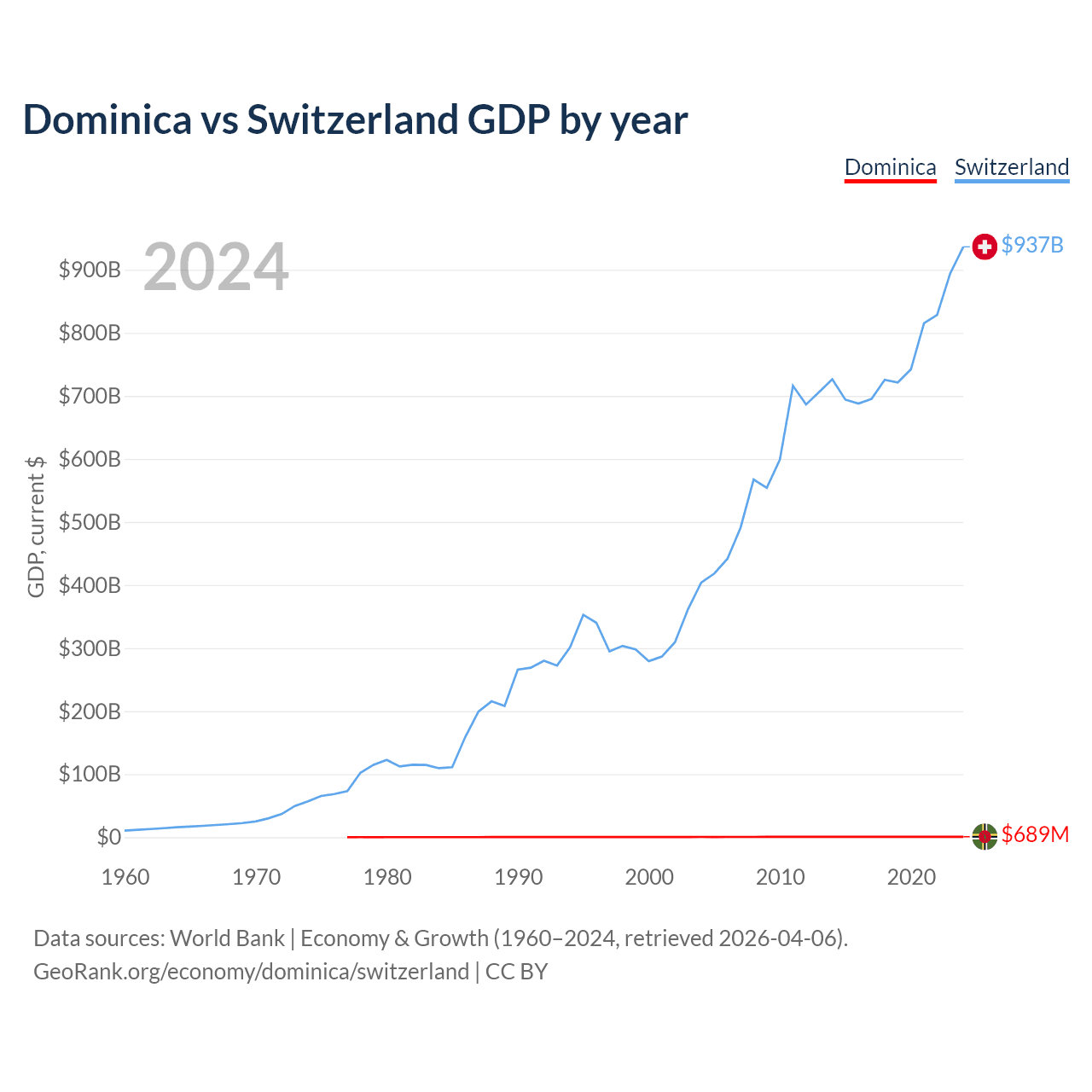 Dominica has a GDP of $689M compared to $937B for Switzerland, ranking 190/197 and 20/197 by economy size, respectively.